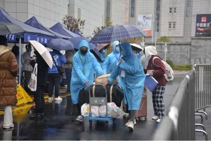 10月9日,金沙官网2022级研究生新生入学报到,金沙官网团委青年志愿者工作部组织志愿服务工作,青年志愿者工作部成员以及金沙官网招募志愿者参加此次活动。 上午,50余名志愿者早早来到综合楼前坪迎新点处提前了解工作内容,身穿雨衣戴好口罩,时刻做好迎新准备。志愿者严格遵从疫情防控要求,查看了研究生新生的健康码、行程码以及有无高风险地区旅居史,确认无误后帮助他们搬运行李,引导新生顺利入住宿舍并熟悉校园。学院领导、相关部门老师也积极参与到服务工作中,对家长车辆进行管理。在所有行李进行消毒杀菌后,志愿者将研究生带领至食堂前坪处进行报道并派发学校文创产品,迎新工作有条不紊地进行着。