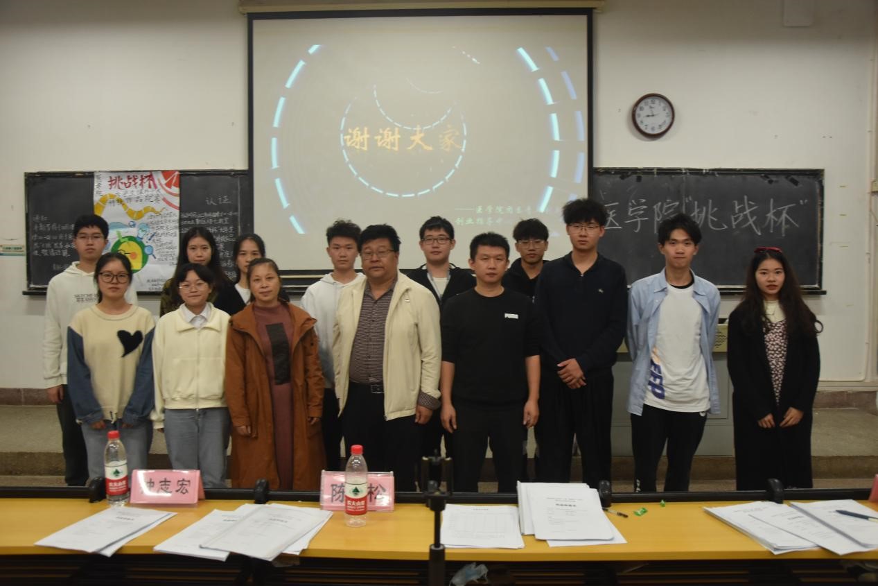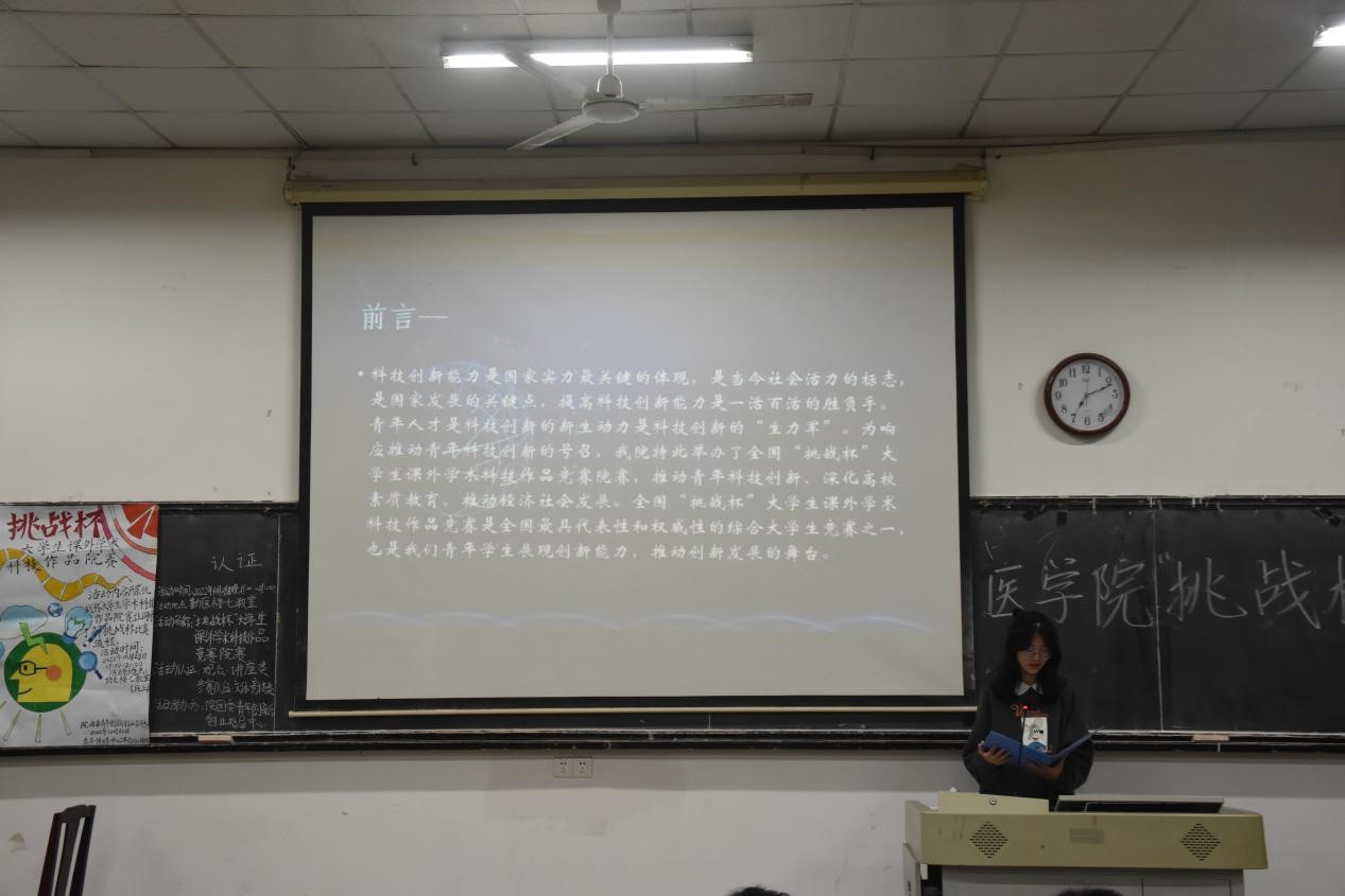 10月28日晚,第十八届“挑战杯”大学生课外科学技术作品竞赛院赛在金沙官网勤医楼七教室展开。竞赛邀请到院党委副书记陈松、副教授邹辉、微生物学与免疫学检验教研室的讲师钟志宏担任评委,2022级药学班万雨欣担任主持人,共有八支队伍参与比赛,金沙官网部分学生通过腾讯会议观看此次活动。