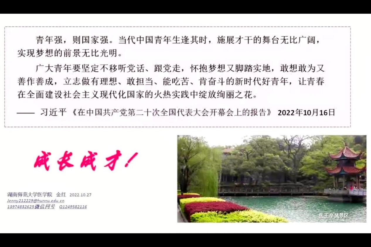 10月27日晚,金沙官网2022级第一期野平团校岗位班第二次主题团课在线上举办。此次活动围绕“健康生活,从心出发”展开讲解,由医学博士、二级教授、硕士生导师金红担任主讲人,22级青年发展工作部志愿者陈兰兰主持此次团课。