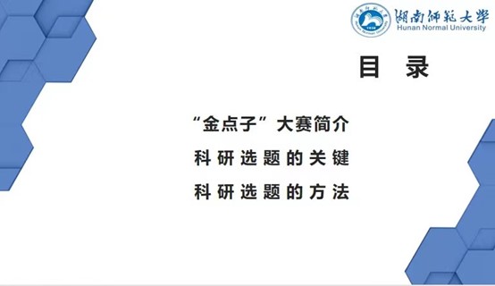 曹莹首先详细讲述第十二届“金点子”创意大赛的具体内容。她从“何为创新”“创新的途径”“科研选题的方法”等方面让同学们更深入地了解该如何入围“金点子”创意大赛,其中她着重强调了参赛项目应具备“创新性”和“可行性”。在最后的互动环节中,曹莹对同学们提出的相关问题进行逐条解答,并结合自身的参赛经历向同学们传授可靠的参赛途径以及该如何寻找导师协助,调动了同学们对比赛的兴趣和信心。