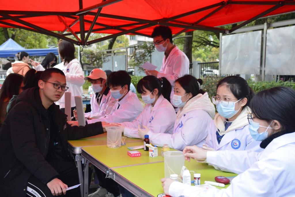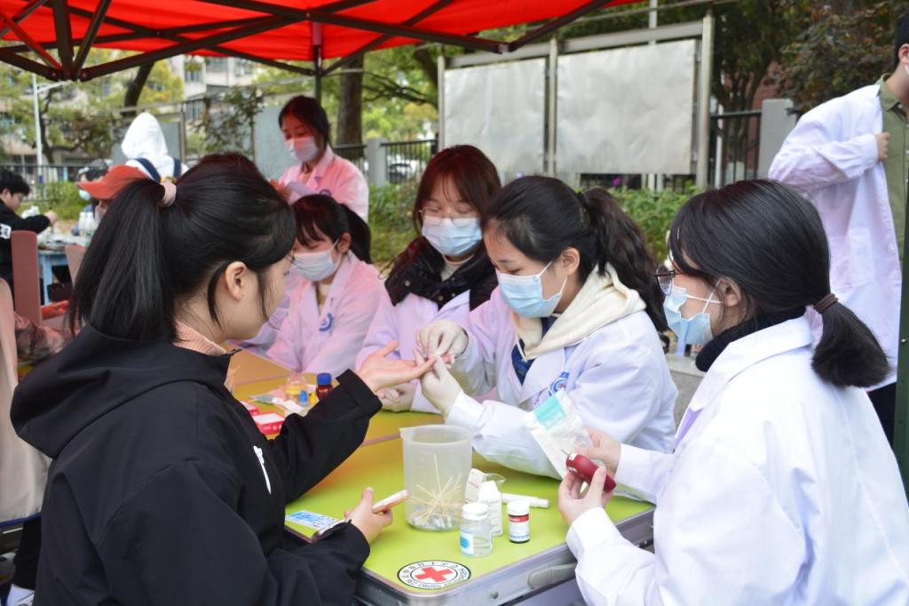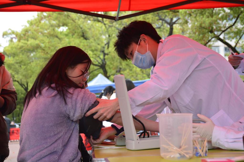 3月26日,金沙官网红十字会健康咨询队和志愿服务队在田径场开展“爱之翼,守护健康在行动”志愿服务活动,为参加医学文化节的师生们免费测量血压、血糖和血型。