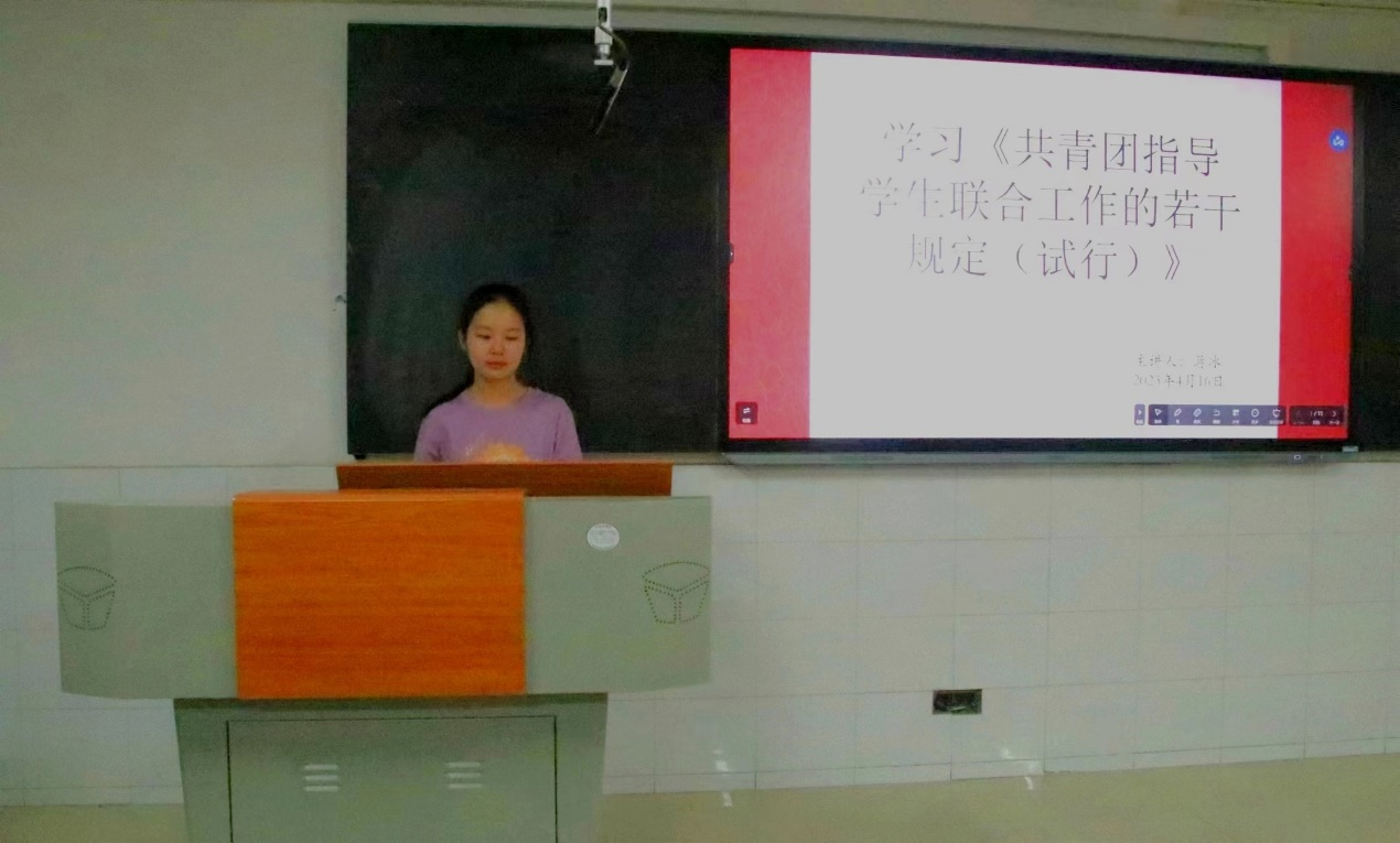 4月16日晚,金沙官网学生会办公室主办的以“学习《共青团指导学生联合工作的若干规定(试行)》”为主题的红色文化学习活动在仁医楼教室204开展,此次活动由22级卓医班蒋冰主讲,学生会全体成员参加。