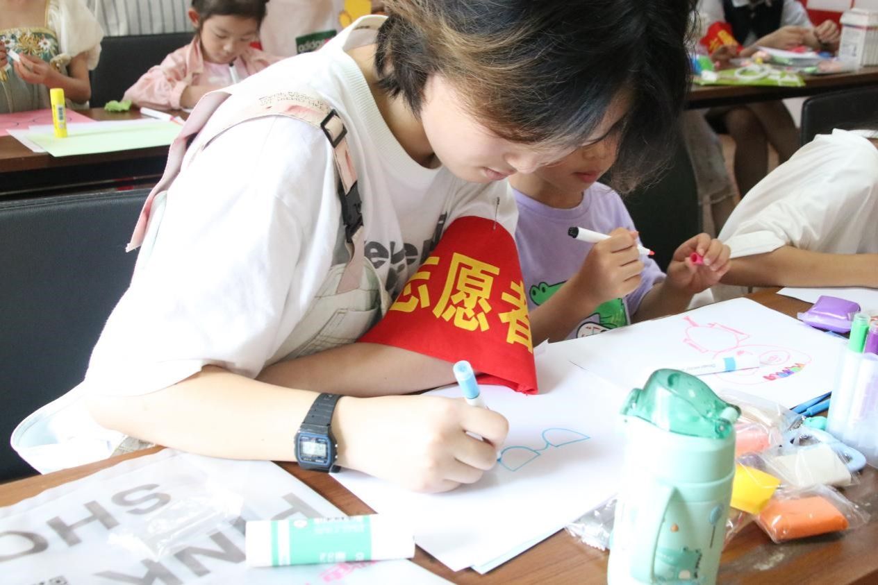 到了实践环节,小朋友们拿出准备好的彩笔、黏土等用具,开始自己的想象与创作,志愿者们也一起帮助他们进行剪纸、绘画、捏黏土等操作。孩子们的作品形式多样、造型丰富、色彩明艳,合影留念后,活动在一片欢声笑语中落幕。