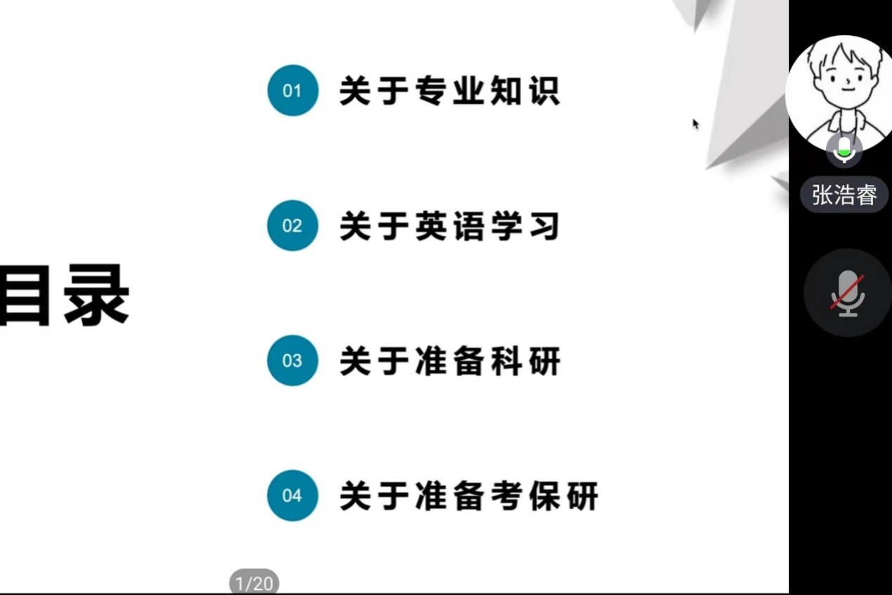 胡泽鑫介绍完此次活动的大体流程后,邀请张浩睿进行本科学习经验分享。张浩睿从专业知识、英语学习、准备科研、准备考保研四个模块重点突出强调教材知识在学习过程中的重要性以及四六级与综测对于考研保研的必要性。