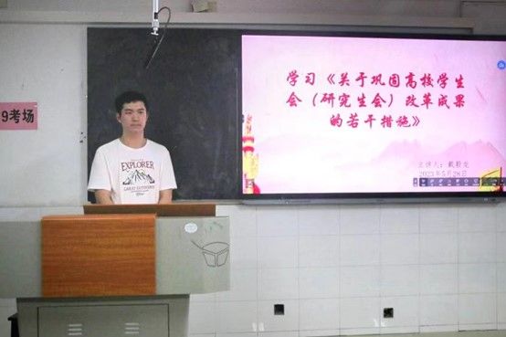在总体介绍完此次活动的流程后,戴毅龙正式开始组织学习《关于巩固高校学生会(研究生会)改革成果的若干措施》。他分别从《关于巩固高校学生会(研究生会)改革成果的若干措施》的具体学习内容及其重要意义让各成员更深入地了解到习近平总书记关于青年工作的重要思想。他着重讲述了《关于巩固高校学生会(研究生会)改革成果的若干措施》的具体学习内容该如何进行,从把牢政治方向到抓实队伍建设再到压实工作责任步步推进,使学生会各成员深切感受到党的温暖、愿意积极响应党的号召,听党话,跟党走。