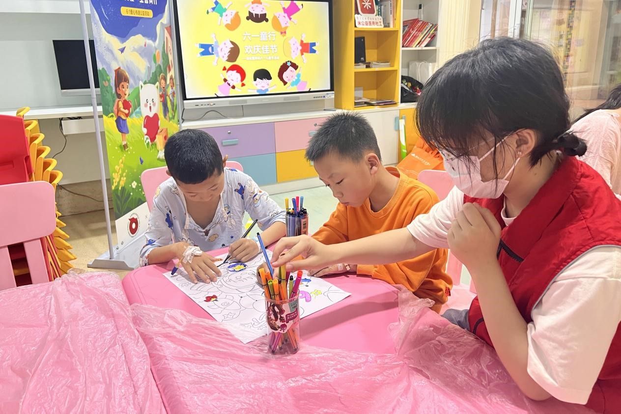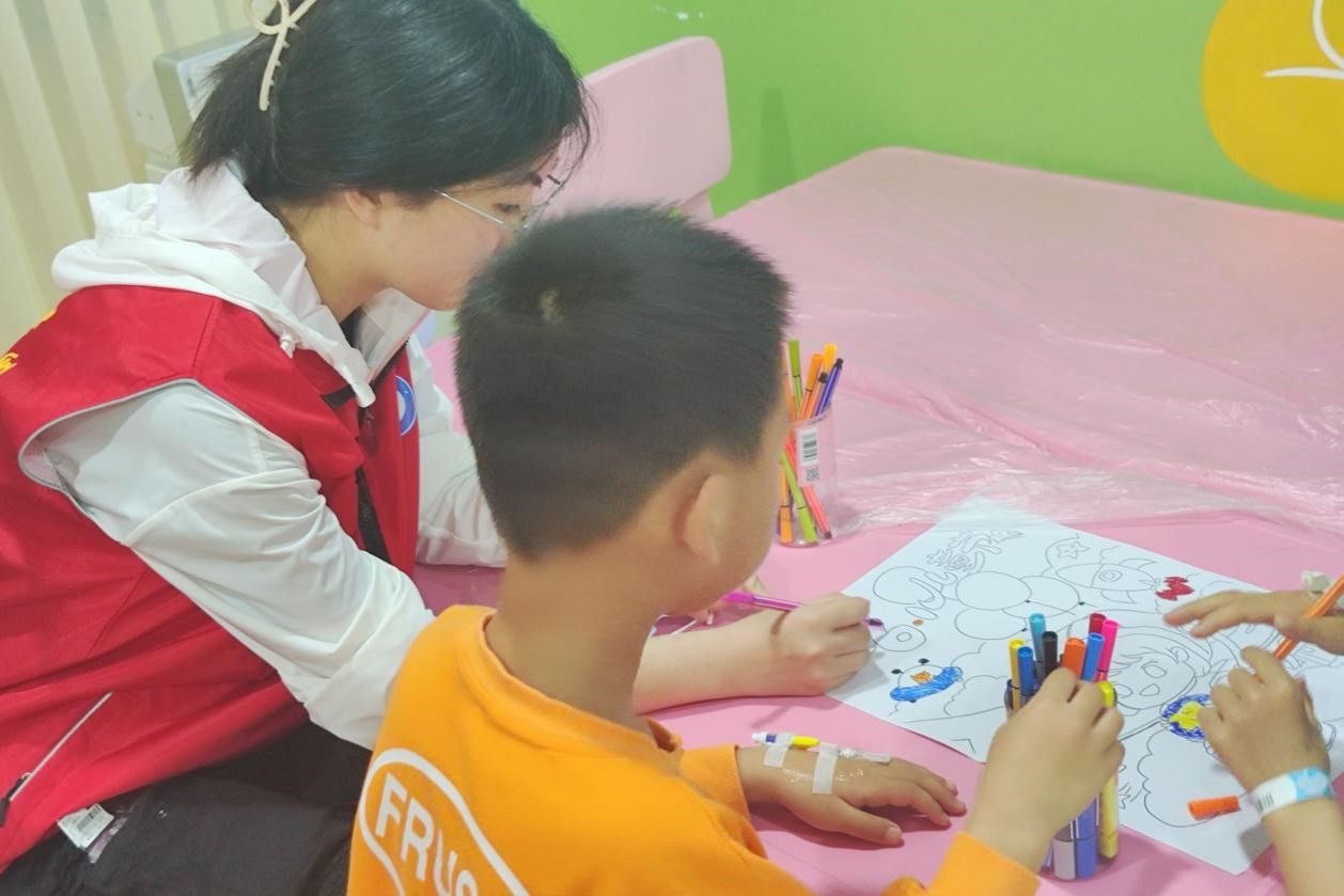 活动开始前,志愿者提前熟悉了活动的主题、流程以及工作内容,为服务住院的儿童做好了充分准备。在与儿童的家长沟通后,志愿者开始此次的志愿活动。为了让住院期间的儿童们能够开心的度过儿童节,缓解在医院紧张的心情,志愿者通过陪他们画画、玩积木、看书等转移他们的注意力,并提前庆祝节日,让他们能够保持童真和快乐,用实际行动消除了患儿们的不安心理,给他们带来欢乐和笑容。