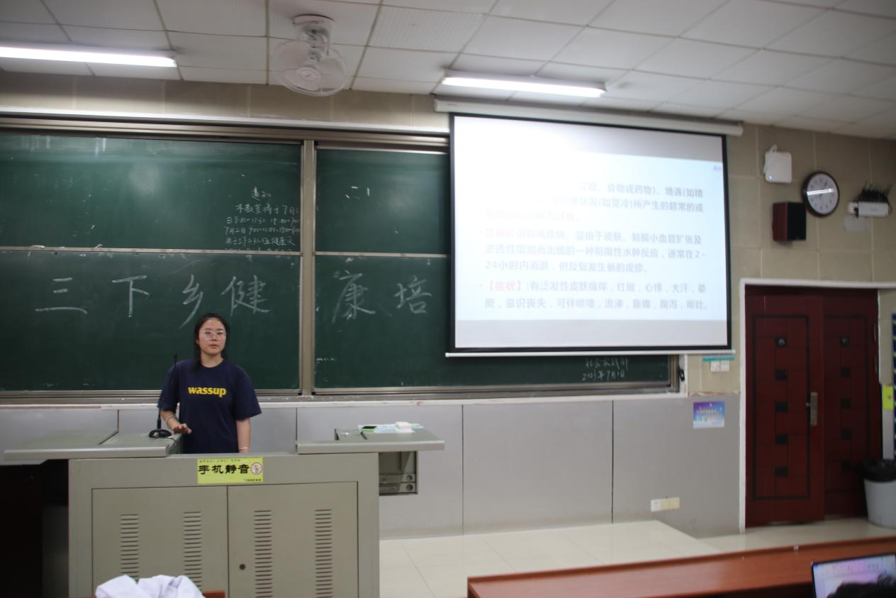 爱心服务队针对生活中常见的健康问题进行原理与处理措施的讲解,包括过敏反应、高低血压症状、头颈躯干外伤、腹痛腹泻等方面的内容。掌握各种病症的病因、临床表现与治疗措施,并能熟练运用进行健康咨询与宣传,正是“文化、科技、卫生”下乡的重要意义所在。