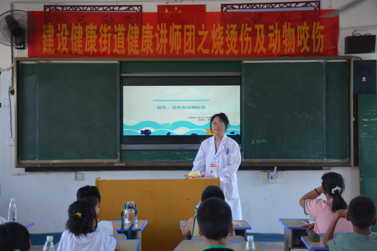 健康知识宣讲由“天使在人间”暑期社会实践团成员张湘担任主讲,主题为“烧烫伤及动物咬伤”。张湘通过幻灯片,生动形象地向同学们介绍了烧烫伤中的三度九分法,并通过有奖竞答的方式,加深同学们对知识的印象。此外,张湘还向同学们介绍了有关狂犬病的发病机理与治疗措施,获得了同学们的积极反馈。