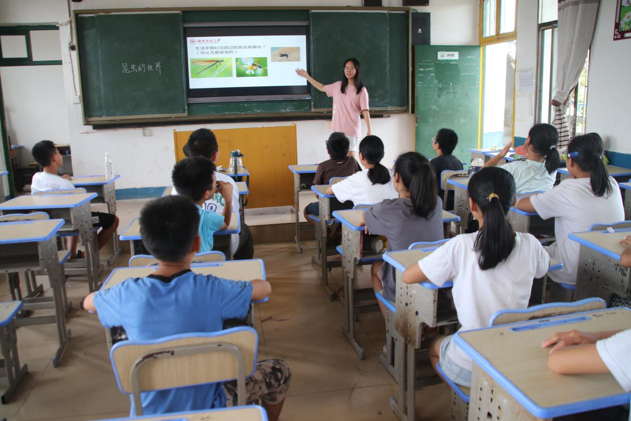 7月12日上午,金沙官网“天使在人间”暑期社会实践团于邵阳市檀江中学开展自然科普课程。此次课程的主题为“昆虫的世界”,由实践团成员吴金金担任主讲。