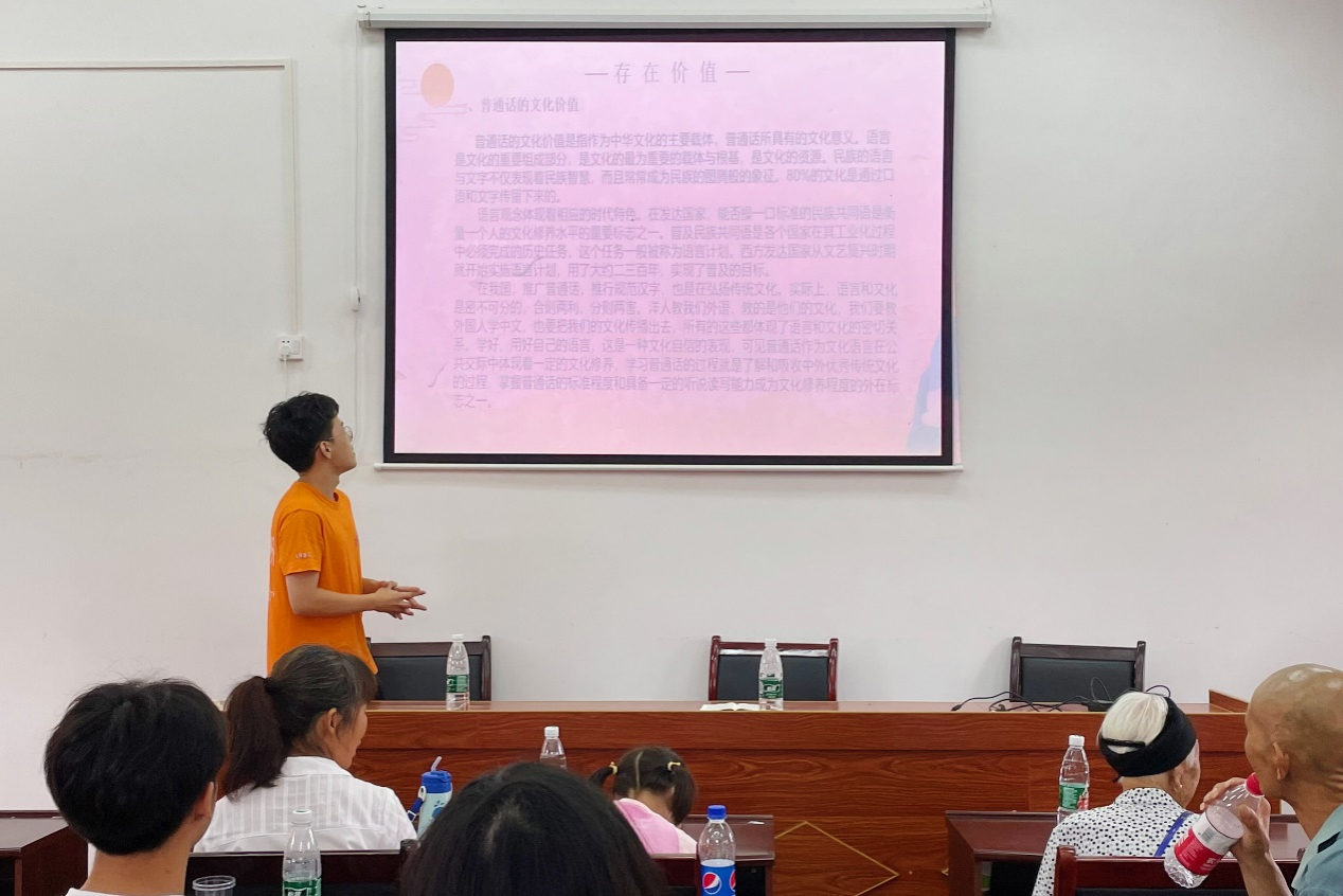 冯森倬首先从普通话的由来发展进行讲解,向乡民们介绍道普通话以北方话为基础方言,有清代满族人两百多年的推广历史和基础。随后,冯森倬向乡民们讲述普通话存在的价值,从文化价值、审美价值以及存在价值三个方面来说明普通话是中华文化的主要载体,是不可或缺的。