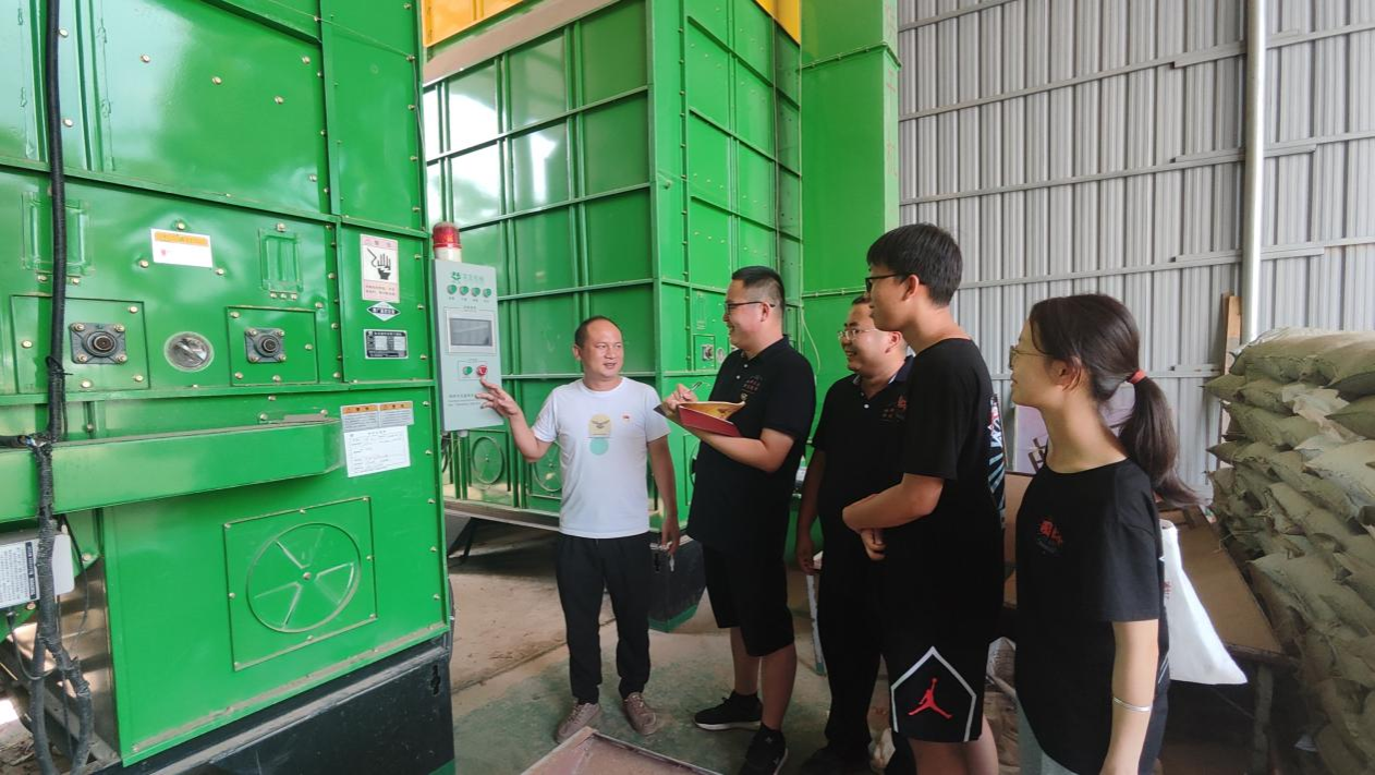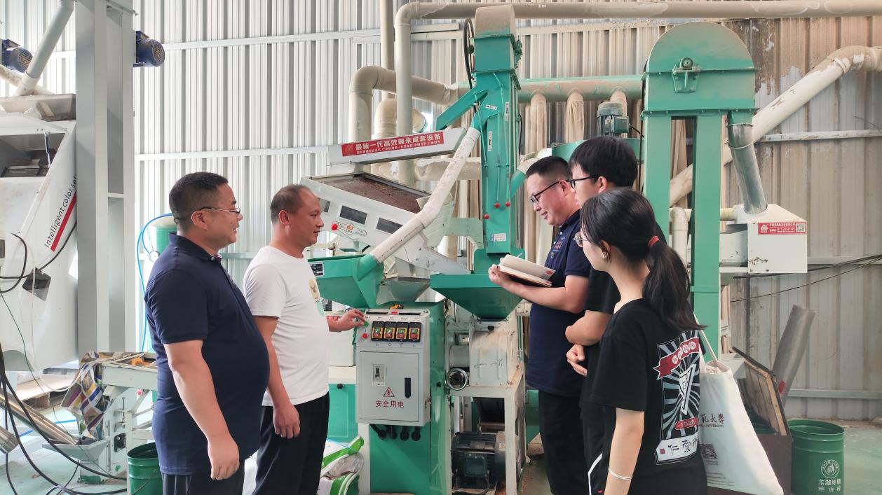 当日上午,实践团来到小塘铺村黄桃种植基地,面对结满丰硕果实的黄桃山,实践团主动提出帮助农民干农活,在农民的指导下进行锄地浇水以及黄桃的采摘等一系列活动,了解黄桃生长料理所需要经历的步骤。接着,农民们邀请实践团成员品尝黄桃,在品尝的过程中为实践团成员介绍黄桃种植基地的规模和历史、黄桃料理过程中的注意事项、黄桃销售的流程及常见问题等,让实践团成员从多方面了解黄桃基地。随后当日下午,实践团来到了坳山村集体经济合作社,由坳山村党支部书记邓国波带领实践团参观碾米设备及稻谷烘干加工中心,介绍碾米的步骤、稻谷烘干及大米加工产业,水稻“种、产、销”全产业链条。