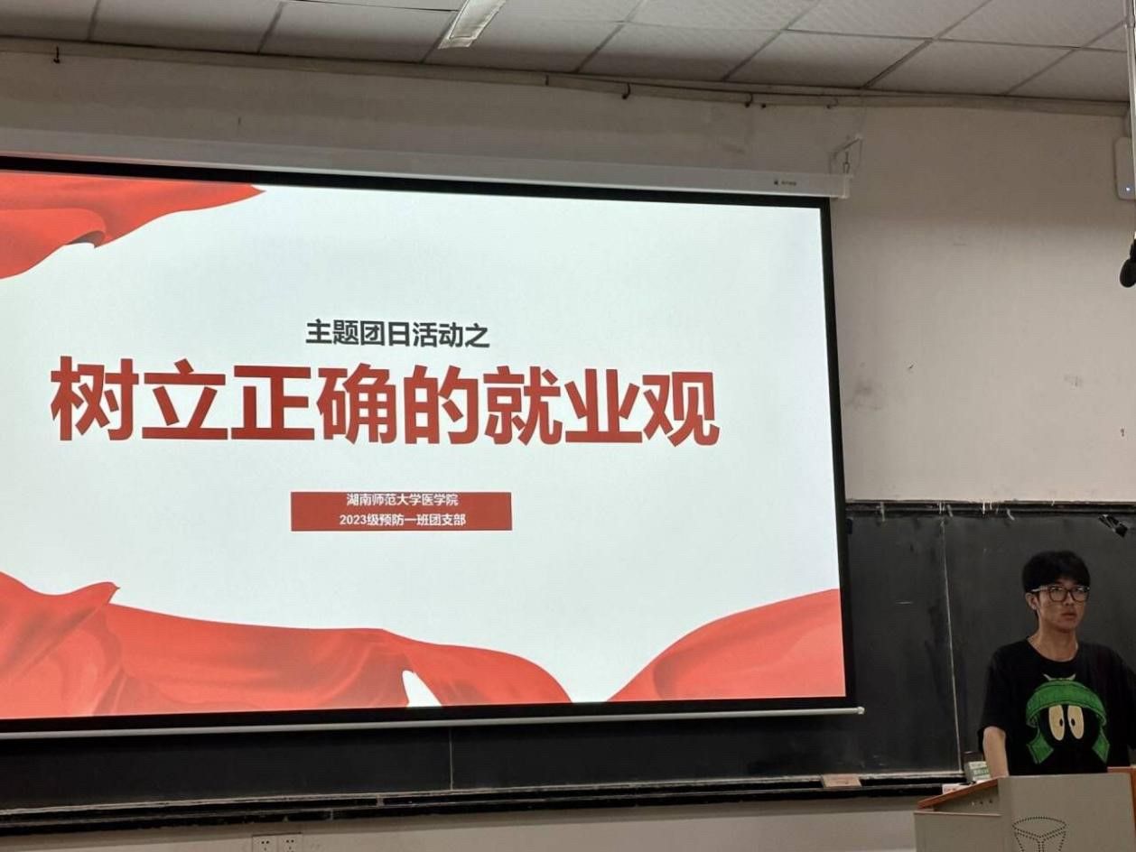 2023年10月16日,2023级预防一班开展以“树立正确就业观,志向笃定奋楫行”为主题的团日活动。23级预防医学专业学生参加活动,预防医学系党支部书记陈适出席活动。