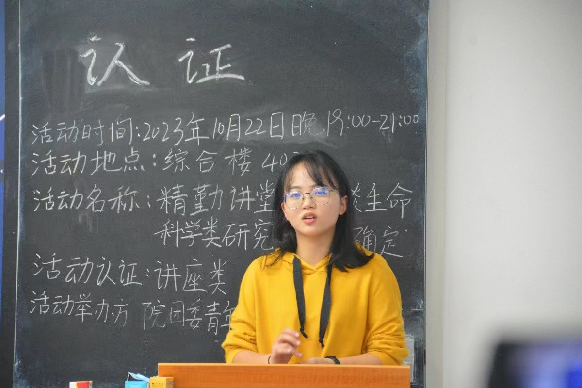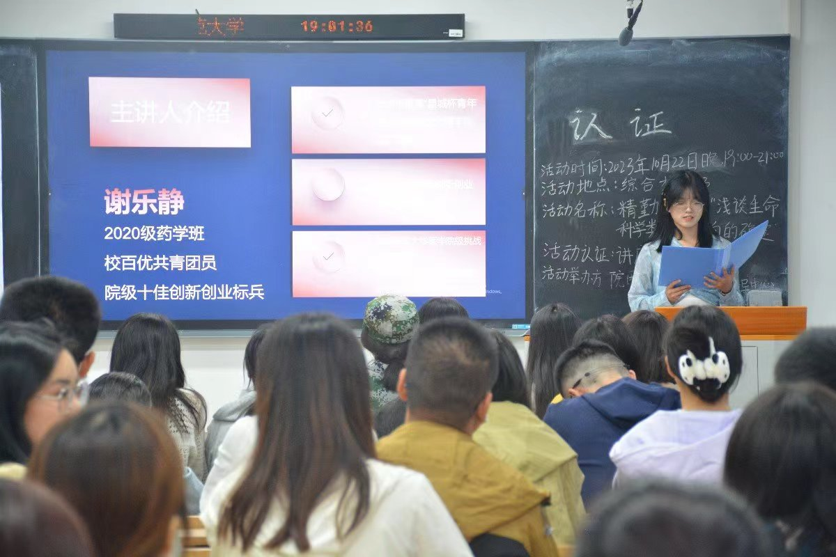 10月23日晚,金沙官网团委青年创新创业指导中心于综合楼403开展精勤讲堂之“浅谈生命科学类研究方向的确定”讲座。此次活动由团委青年创新创业指导中心志愿者朱玉如主持,2020级药学班谢乐静担任主讲人,金沙官网部分学生参加。