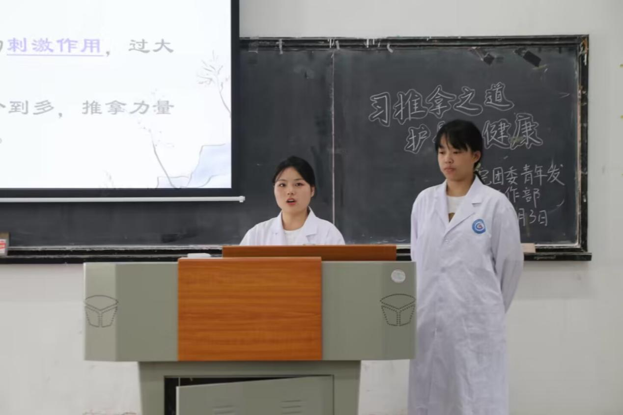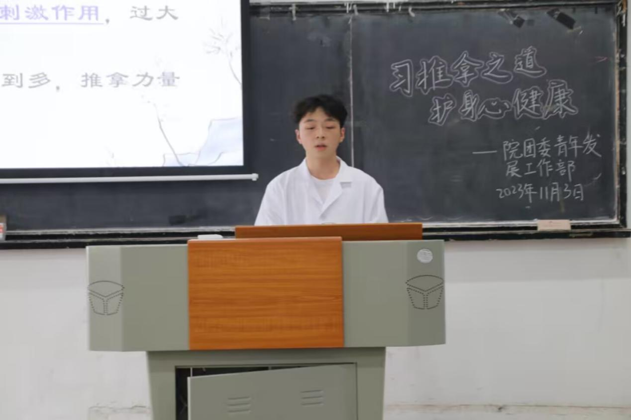 李艳芳由推拿疗法的基本定义引入团课内容。杨湛详细介绍了推拿疗法的定义、作用和优点,并对推拿手法的要点、作用部位和注意事项进行讲解。他也介绍了各种手法的疗法作用及主要治疗的病症,表明推拿对身体健康的诸多好处。