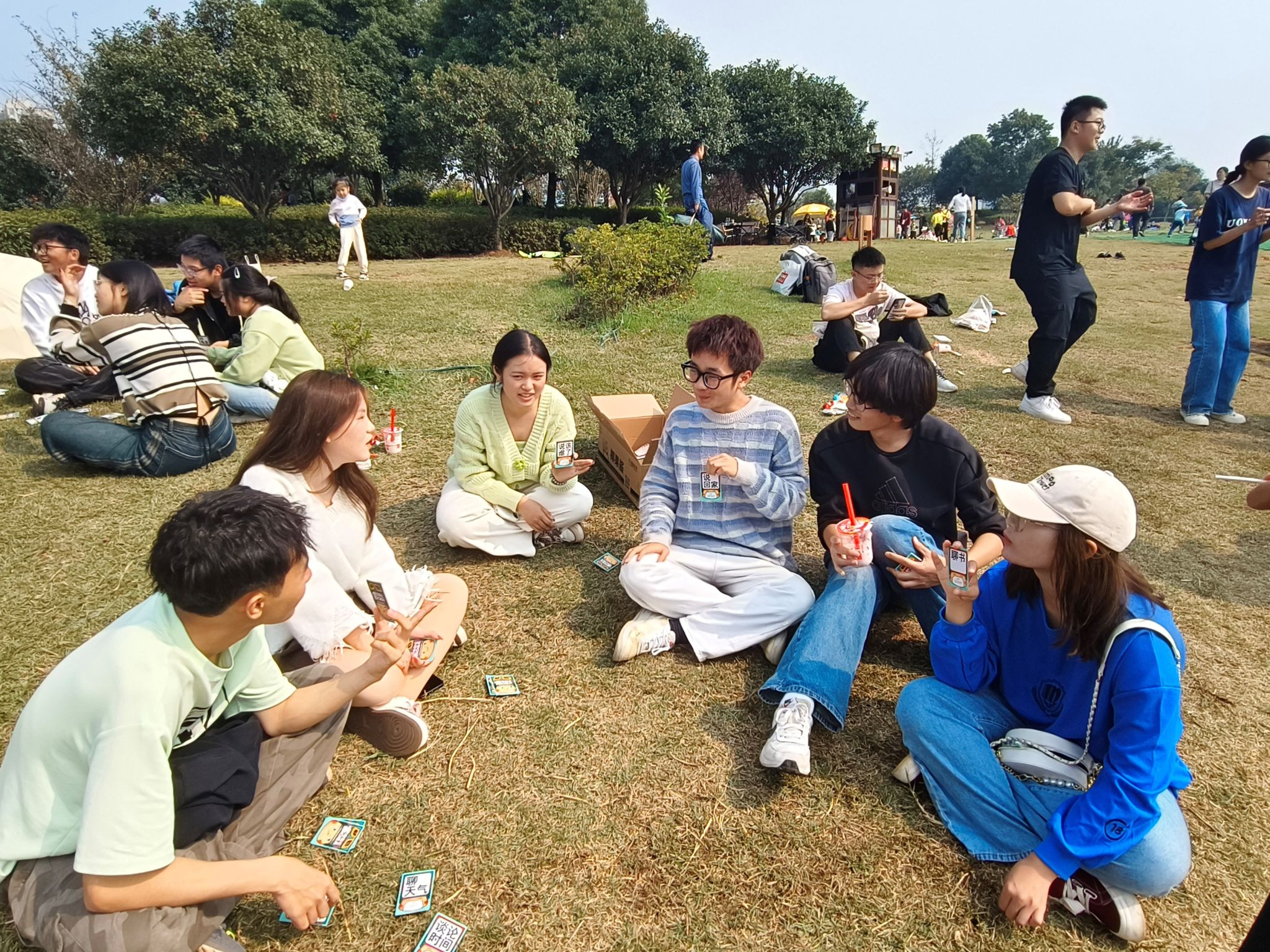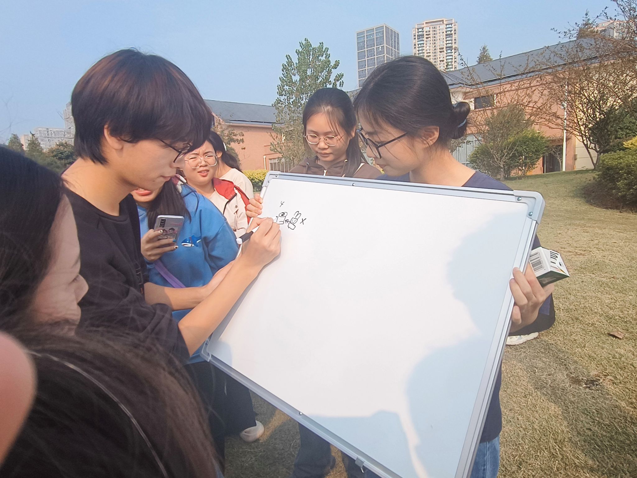 最后是游戏环节。此次团建先后进行了你画我猜和不要这样做两个游戏。其中你画我猜是同学们的最爱,遇到难题时的捉急、窘迫的情态和遇到“知己”时的激动大喊都让人忍俊不禁。而在不要这样做游戏环节中,大家都动起了心眼子,坏笑着,在不经意的聊天中暗藏玄机,每个人都陷入了草木皆兵、一惊一乍的状态,可就算是这样还是会在不经意间破功……霎时间,整个公园洋溢着欢乐的气氛。