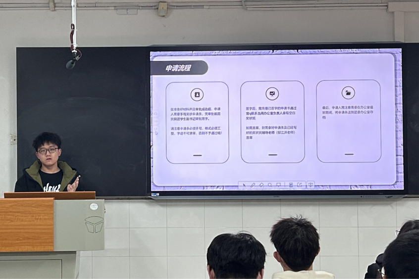 培训会围绕活动“奖状申请”为中心,分“申请前需”、“申请流程”、“具体模版”三个方面进行讲述,由学生会权益维护部谢志鹏担任主讲人。谢志鹏介绍了申请奖状的条件与准备工作,详细讲述了申请奖状的具体流程并列举出奖状的具体模版与既往举办活动申请的奖状成图,以便同学们作参考。最后,学生会执行主席高彦对申请过程中联系各团副与老师们的注意事项进行提醒,并对此次培训会进行了总结。