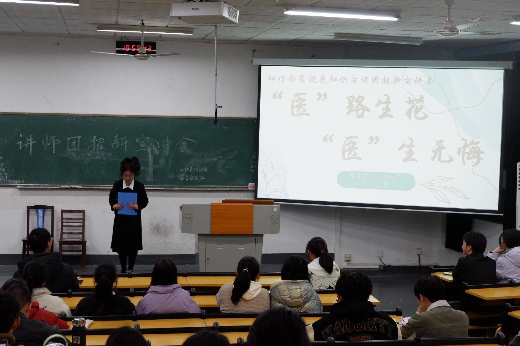 风传花信,雨濯春尘。为了提高大学生基本救护能力,为讲师团注入更多活力,3月18日晚,金沙官网于勤医楼一教室举行了知行合医健康知识宣讲团招新宣讲会。此次活动由团委社会实践部举办,主题为“医”路生花、“医”生无悔,讲师团全体成员及部分学生参加。