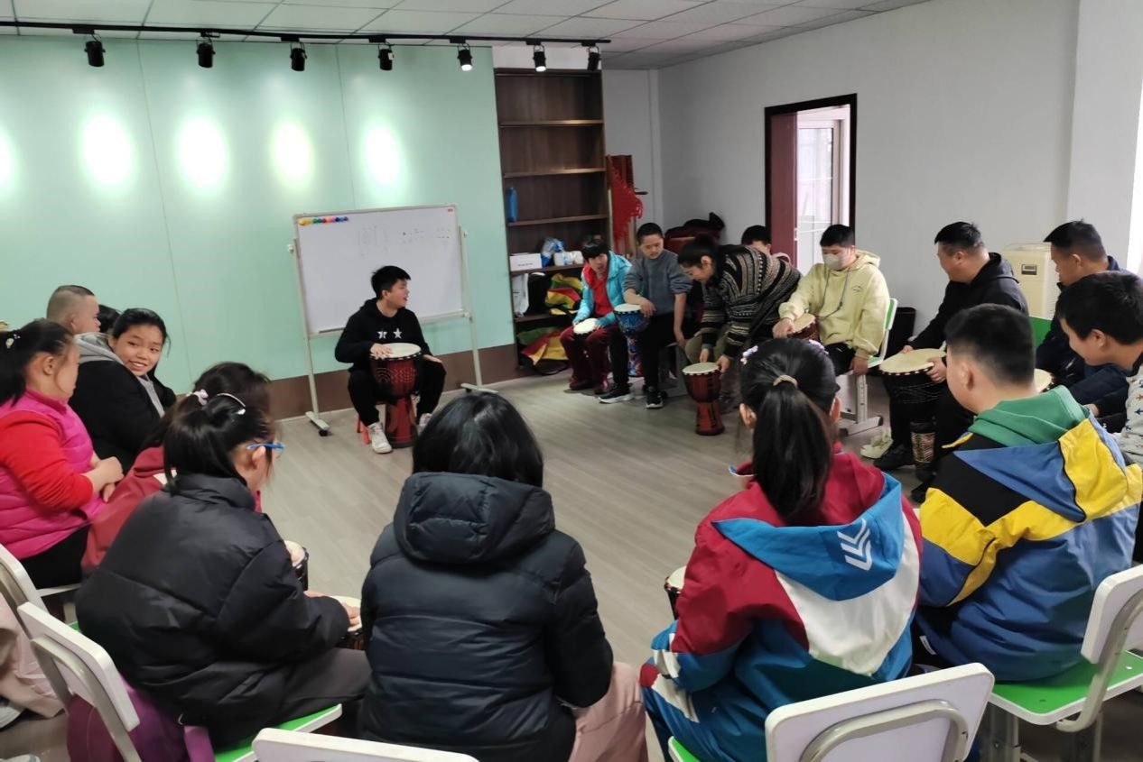 活动开始前,志愿者们为唐氏小朋友们进行签到,并与他们沟通交流,帮助他们进行课前准备。随后,课程正式开始,孩子们围成一圈面对老师,跟随老师一同复习上周学习的节奏类型。老师在确保大家掌握了已学的内容后,开始教授新的节奏并配合歌曲《离别开出花》的片段引导他们反复练习,以便让小朋友们能尽快熟练。孩子们认真积极,专注听讲,在老师指出错误后也努力改进。陪伴在孩子们身边的志愿者也参与其中,在看见部分孩子遇见困难时,便耐心带领他们寻找节拍。在不断的分组练习和集体练习后,课堂进入尾声,大家一同为《离别开出花》整首曲目伴奏,孩子们和志愿者们都收获颇丰。