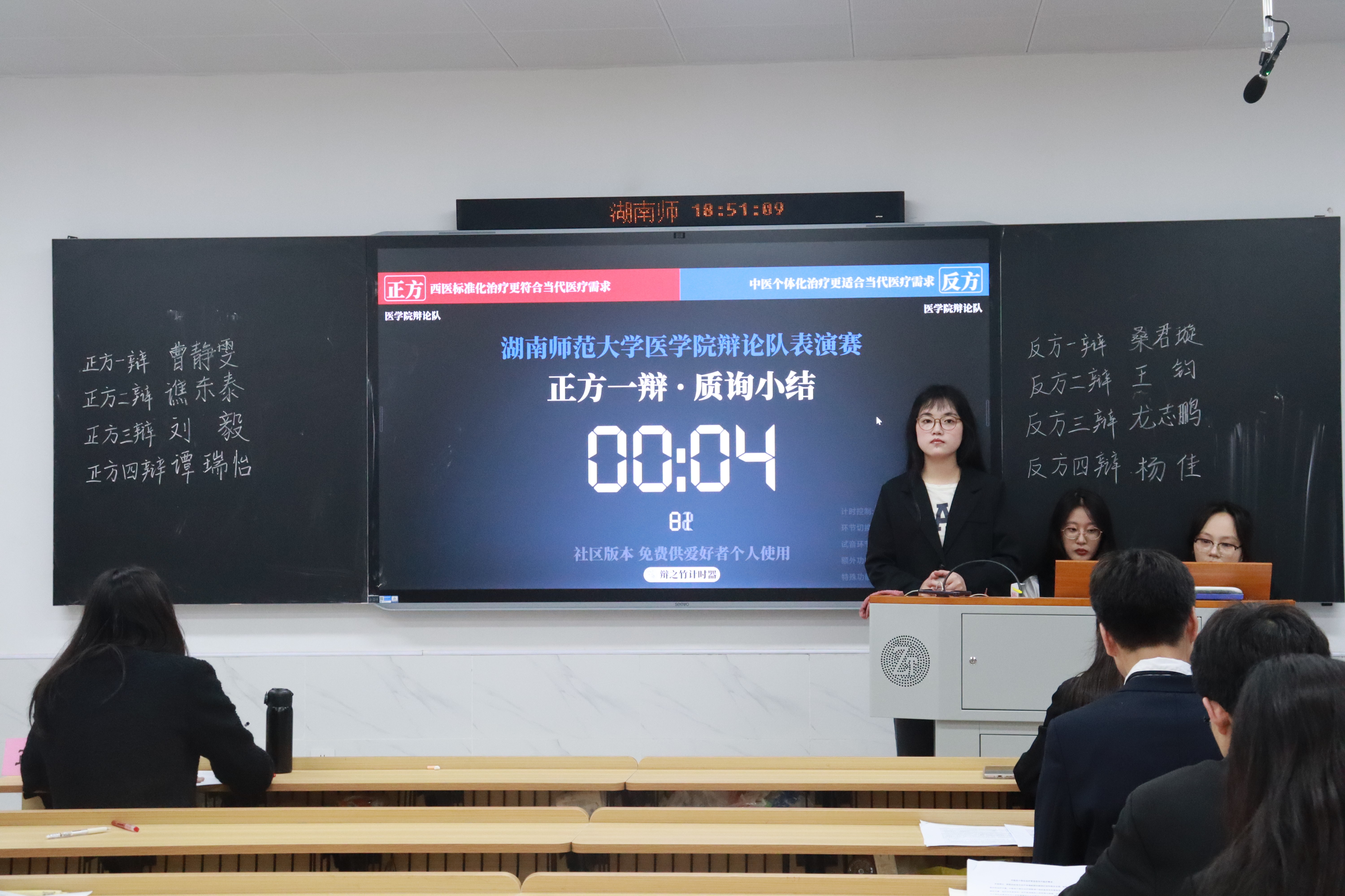 正反两方通过立论陈词、驳论、盘问、自由攻辩、总结陈词等环节,就“西医的标准化治疗与中医的个体化治疗哪个更适合当代医疗需求”展开交锋。参赛选手们紧扣辩题,聚焦现状,围绕中西医治疗的优劣和现有的医疗政策展开论述,双方辩手在思想碰撞和言语争锋中展现出严密的逻辑和良好的辩论素养。最后,评委从论证思路,表达技巧等方面对各位辩手进行点评。她强调,西医的标准化治疗与中医的个体化治疗都是现代医疗诊治中的一部分,需要在具体实践中依实际给出更适合医疗需求的方式。