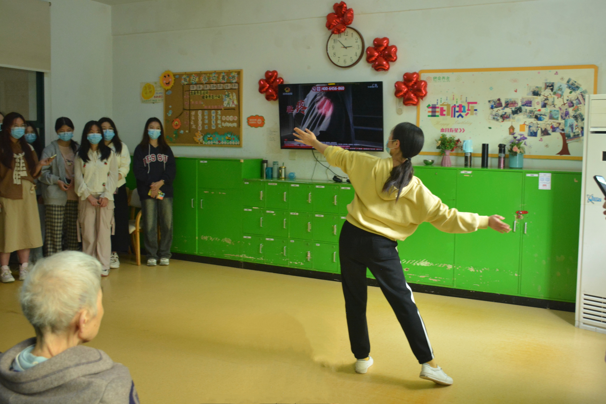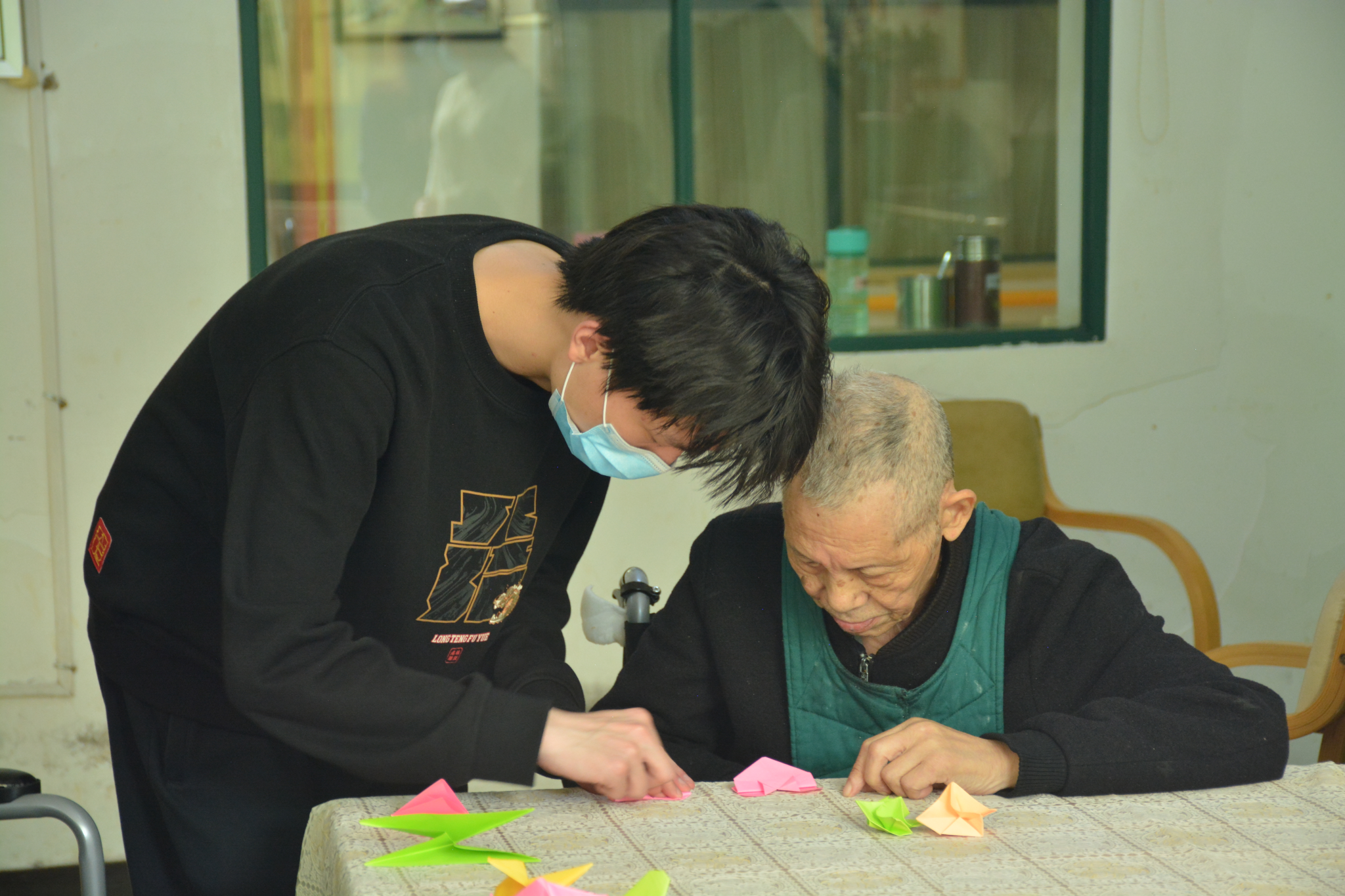活动开始前,志愿者们做了精心的准备,他们热情地为老人们演唱经典歌曲,表演欢快的舞蹈,让整个下午充满了欢乐和温馨。老人们随着熟悉的旋律拍手哼唱,有的甚至跟着音乐舞动起来,场面温馨而活跃。这些年轻的面孔和充满活力的表演为老人们的生活增添了一抹亮色,也让他们感受到了社会的温暖和关怀。随后志愿者们耐心为老人教授折纸技巧。老人们在志愿者的指导下,动手折出了美丽的纸鹤和爱心,脸上洋溢着幸福的笑容。