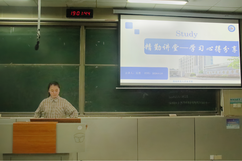 4月14日晚,金沙官网团委青年创新创业指导中心于仁医楼306开展精勤讲堂之“学习心得分享会”讲座。此次活动由团委青创志愿者李孟霖主持,2021级检验一班吴思担任主讲人,金沙官网部分学生参加。