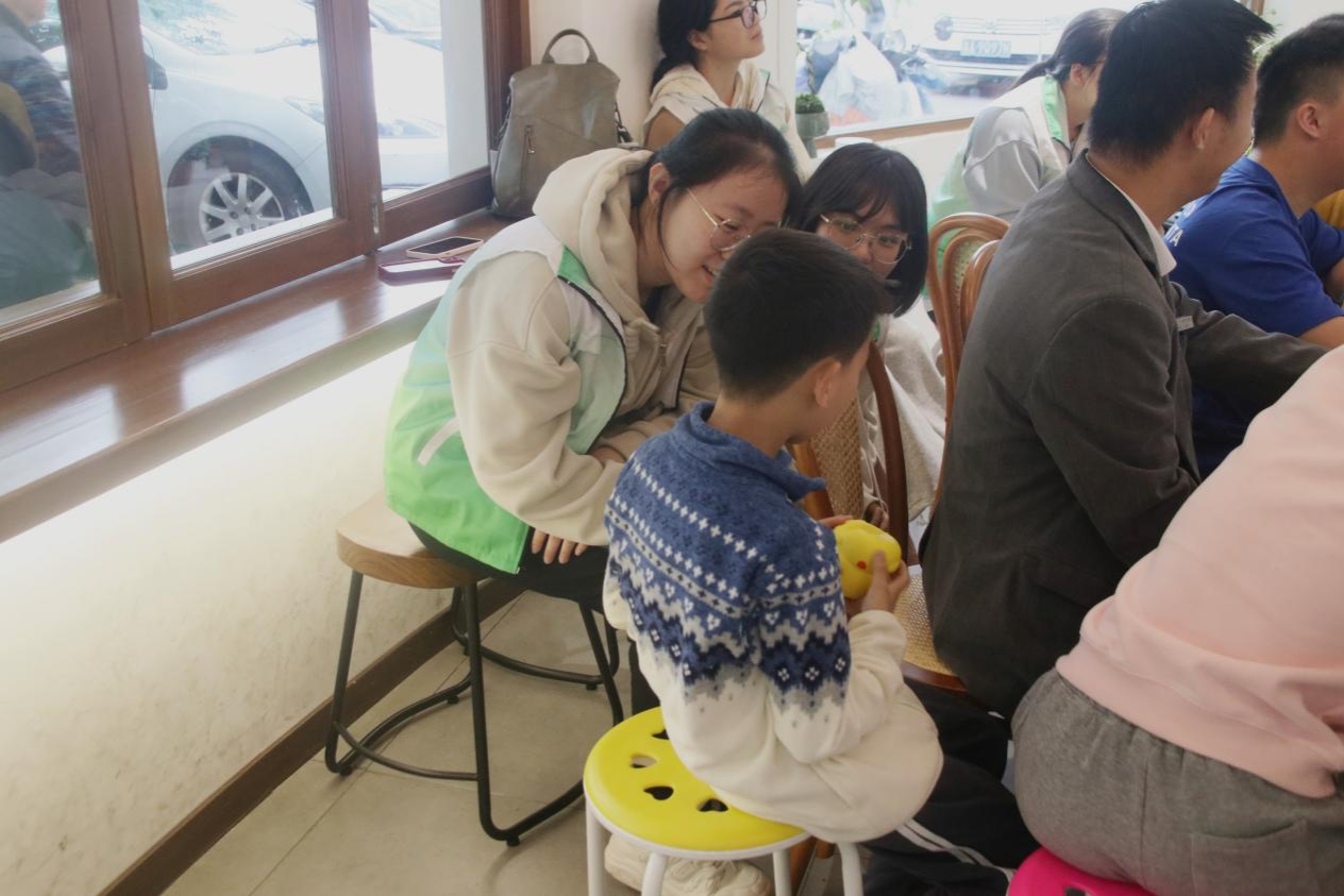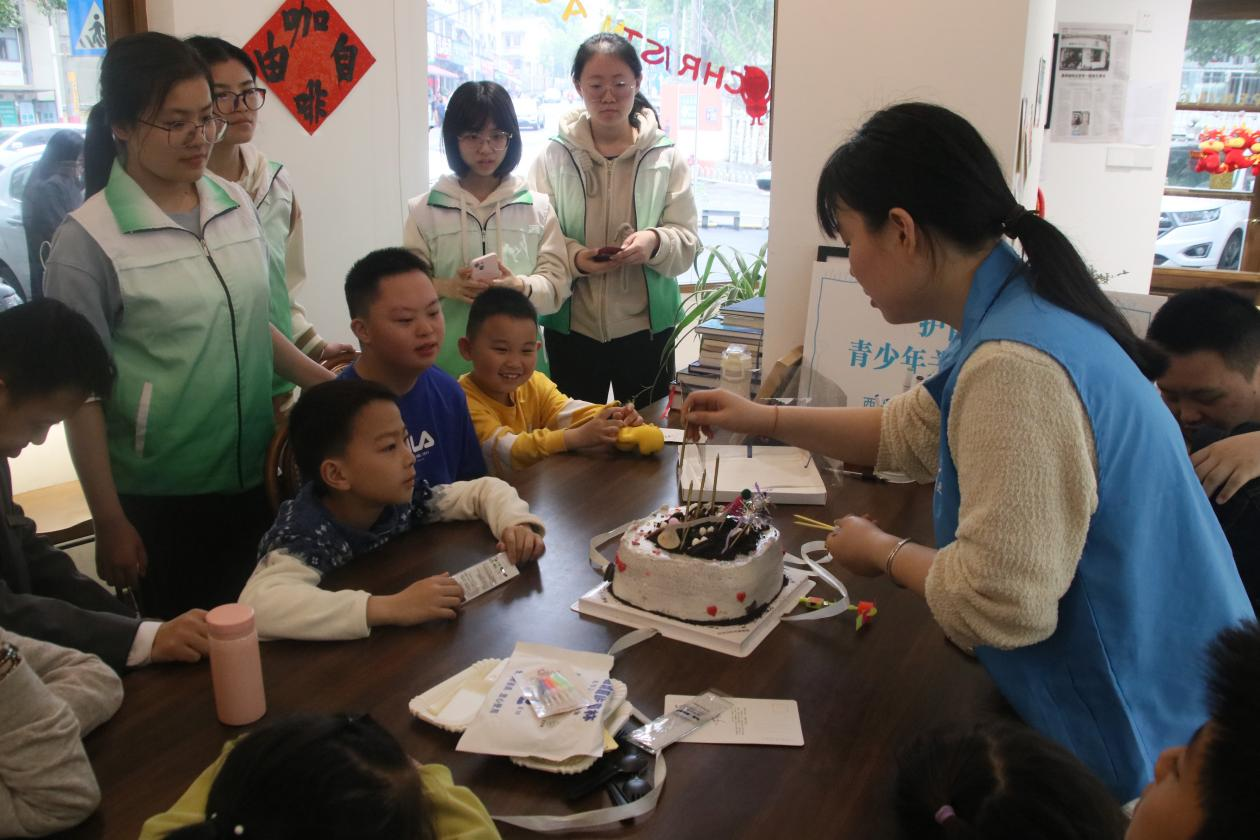 4月21日上午,金沙官网团委青年志愿者工作部组织志愿者前往糖果咖啡店协助唐果之家举办心青年生日会。