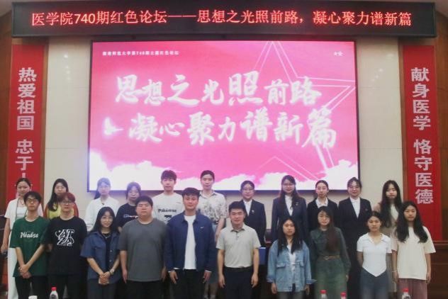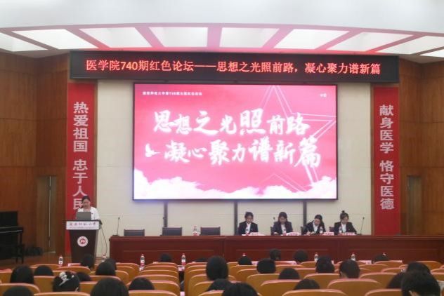 会上,章行健、李雨珊、孙若晗、曹卜子四位优秀学生代表围绕此次论坛主题作出相关演讲,她们深入讨论了习近平新时代中国特色社会主义思想的主要内容、重大意义及深远影响,并对同学们提出了期望与鼓励。习近平新时代中国特色社会主义思想是党的指导思想,是又一伟大的时代贡献、思想贡献。其中的人民至上论、人民幸福论等理论皆与医学的初心使命高度契合,医学生应当用习近平新时代中国特色社会主义思想指导实践,坚定信念,实干笃行,与时俱进,踔厉奋发,秉持仁心仁术,将个人生命融入人类医学事业的发展之中。