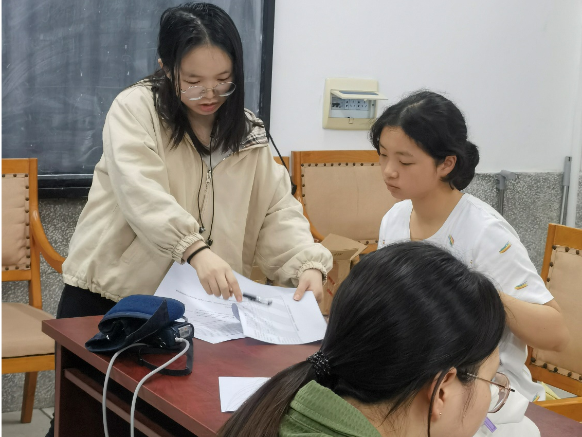 活动开始前,监测人员进行了血压计袖带的正确佩戴、动态血压监测仪器数据读取等动态血压仪操作的培训。活动前期,科研团队收集并整理了血压监测相关资料,并整理简化成推送文章进行宣传,以此向各学院招募志愿者,志愿者根据时间安排,提前一周进行预约。工作人员引导前来做检测的志愿者们填写健康行为习惯记录表和家族血压相关疾病登记表。随后,他们针对志愿者的身高、体重、体脂等数据进行分析,给出详细的电子或纸质检测报告,让同学们对自己的健康水平有深层次的把握。最后,志愿者们需要佩戴24小时动态血压监测仪,并在24小时后归还仪器,由工作人员获取监测数据,将其整理成档。据悉,监测血压的24小时内,志愿者将与受检者进行密切联系,以便及时处理突发状况。
