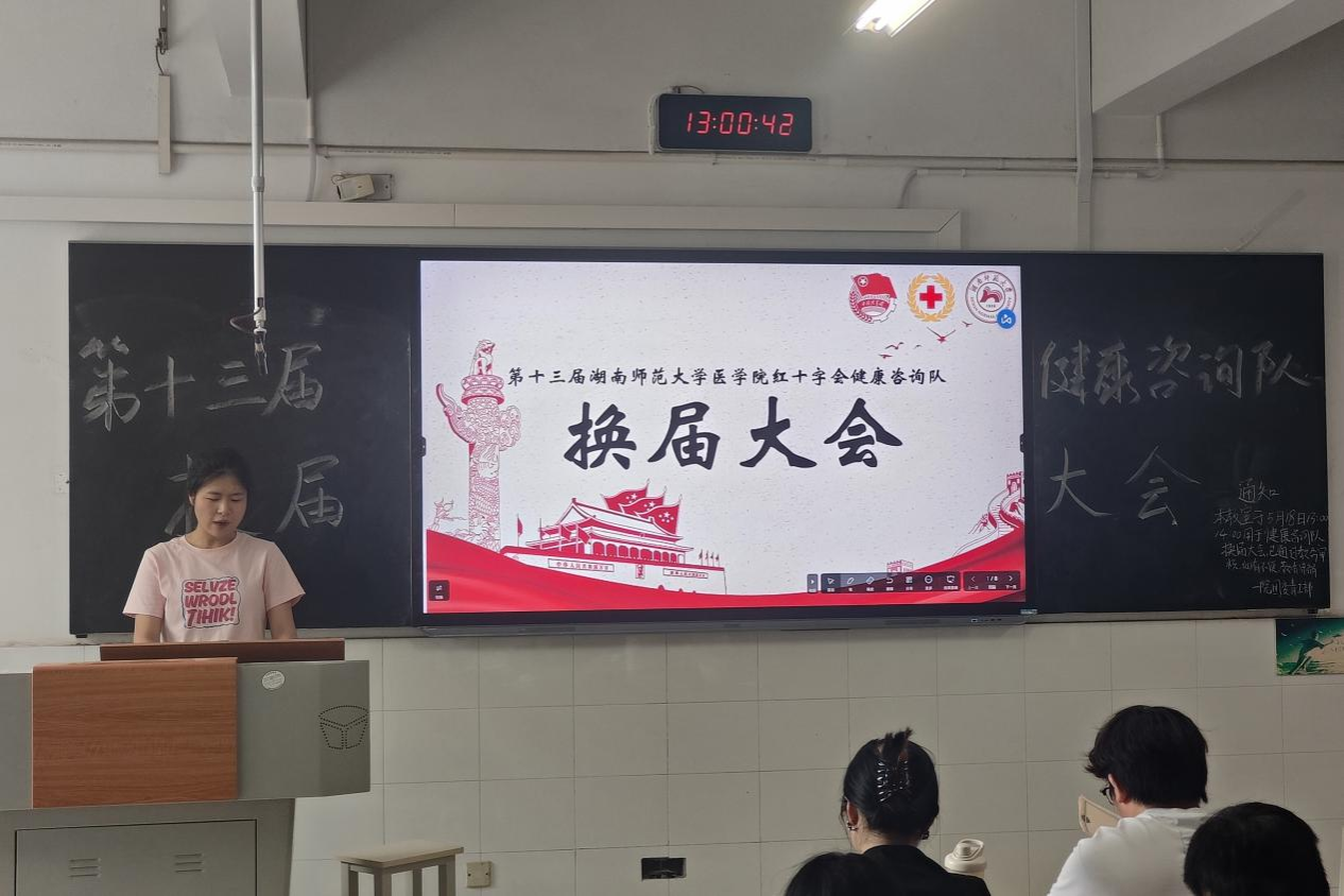 5月18日中午,金沙官网红十字会健康咨询队于仁医楼205教室举办了第十三届换届大会。金沙官网团委副书记兼红十字会秘书长雷璇,青年志愿者工作部执行负责人汪庆臻出席此次活动,健康咨询队全体成员参加。