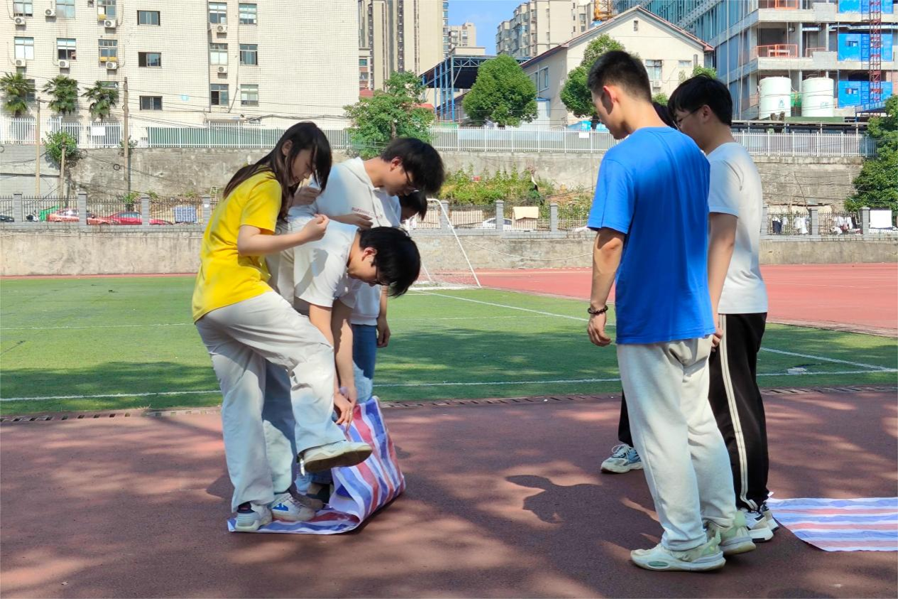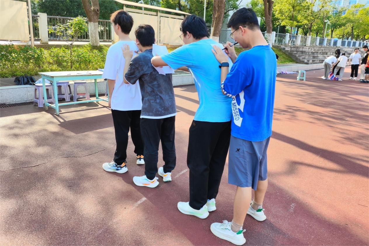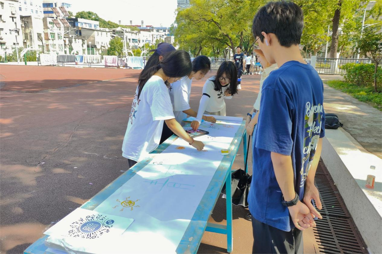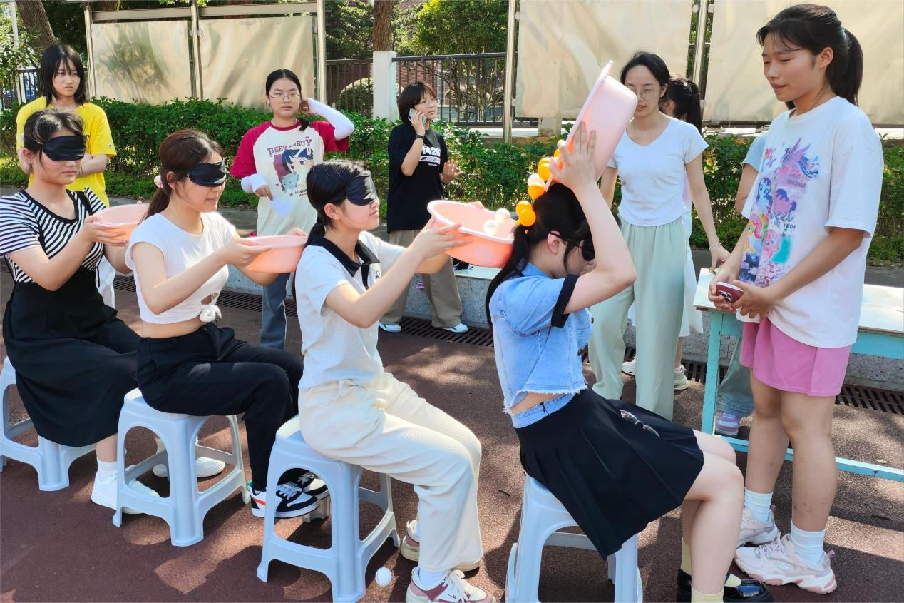 在主题涂鸦现场,学生们在纸上留下心中的“青春”图样,以图画的方式映射出他们的梦想与青春。“心理集市”系列活动又分为三个小项目,大家四人一组参赛。在“默契乒乓球”活动中,参赛者们蒙眼用盆接住前面同学传来的乒乓球,比较最终留在盆里的乒乓球数量;“心灵感应”仅允许身后同学以绘图的形式传递信息,并要求最前面的玩家猜图;“同‘舟’共济”则要求玩家在脚不离开布面的前提下,通过四人合作用手脚将布折叠两次。大家融入集体,体会到与他人互相交流沟通的重要性,靠团体的力量克服困难、达成目标。