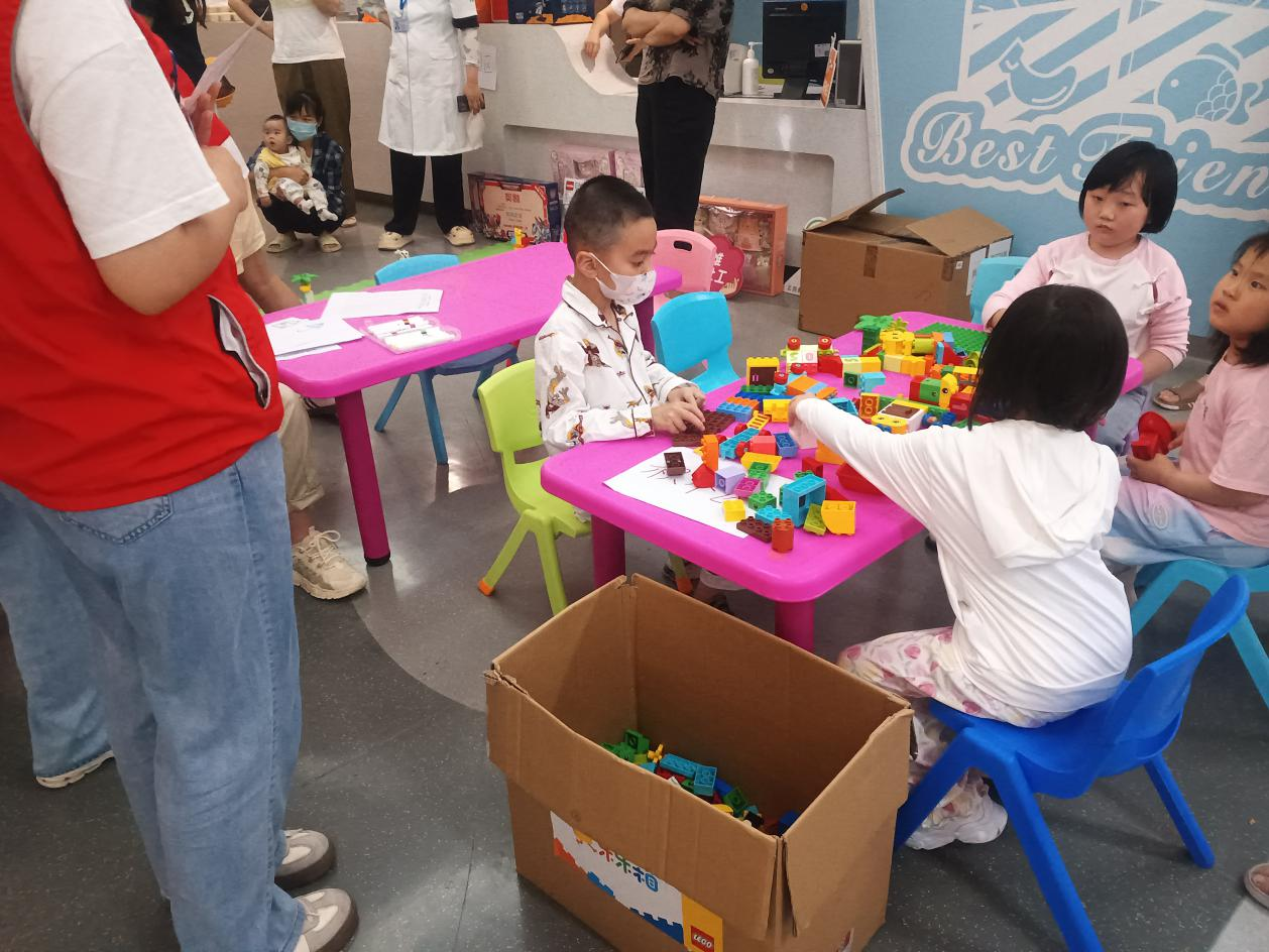 志愿者们在到达医院的消化科室后,领取了志愿服,与医院相关人员对接好服务内容与注意事项后,随即开始了志愿服务。她们和消化科室的孩子们一起拼积木、绘画、做手工,耐心热情地陪伴小朋友们游戏玩耍。在与孩子们的接触中,志愿者们采取温暖的话语,鼓励他们在画纸上尽情创作,搭建出一座座积木模型,发挥想象力完成自己满意的作品,孩子们纷纷沉浸其中,现场的氛围十分轻松欢快。活动将要结束时,家长们也对志愿者们表达了赞美与感激之情。