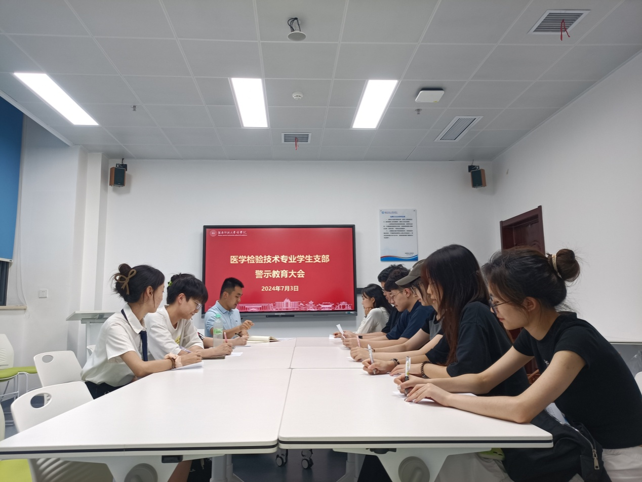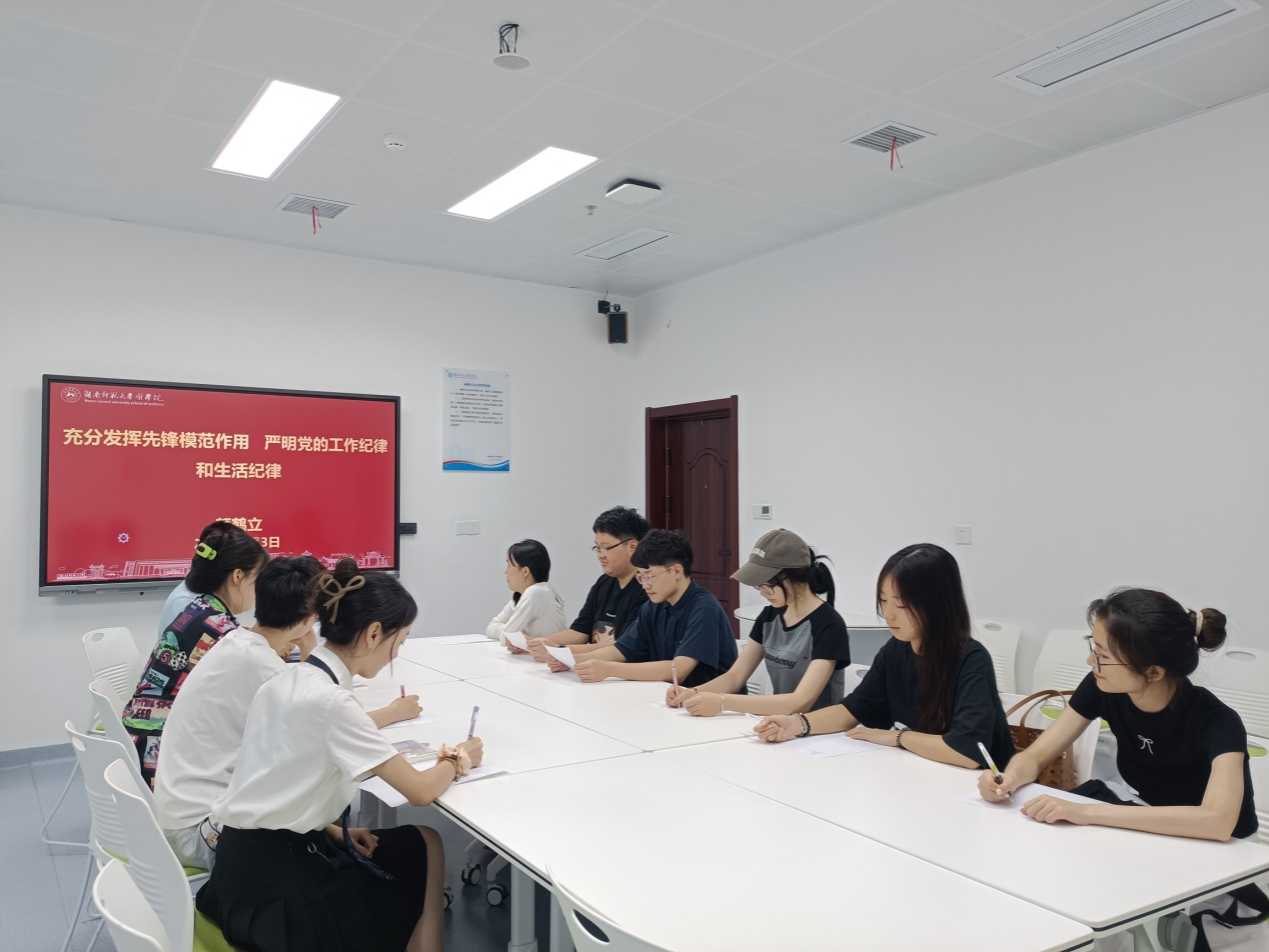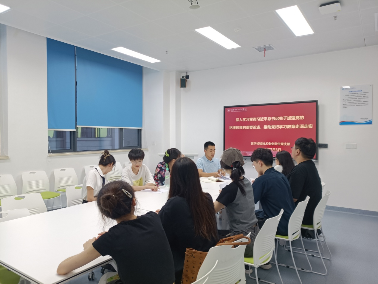 7月3日晚上,金沙官网医学检验技术专业学生党支部在综合楼228会议室开展党纪学习教育专题学习,继续深入学习和贯彻《中国共产党纪律处分条例》,支部全体党员参加会议。会议由支部书记颜鹤立主持。