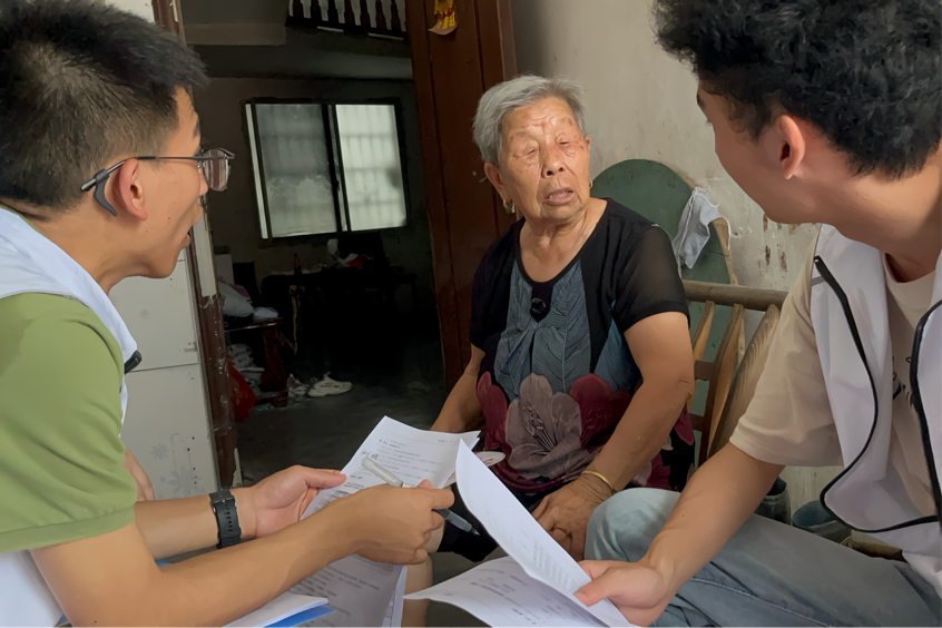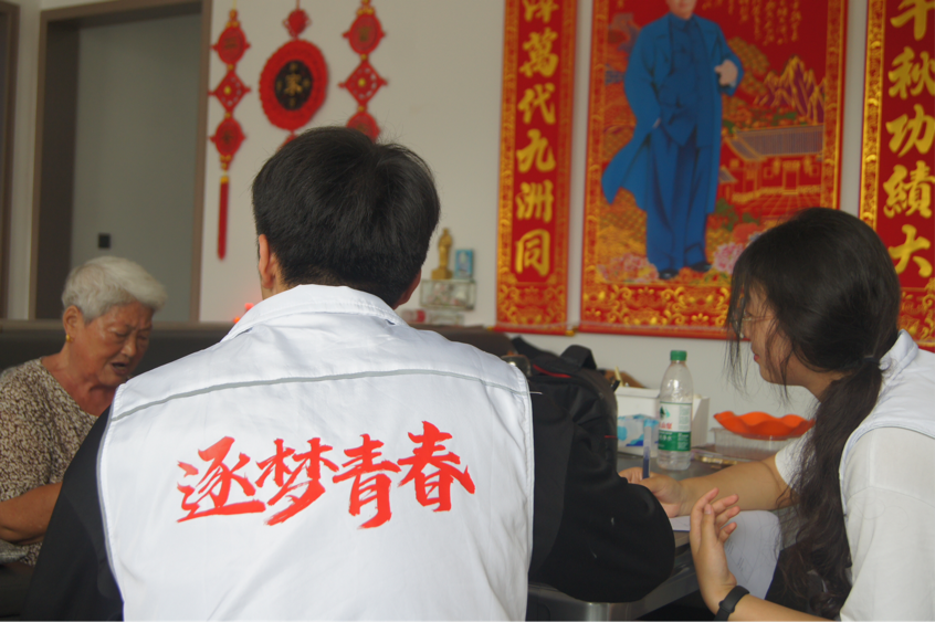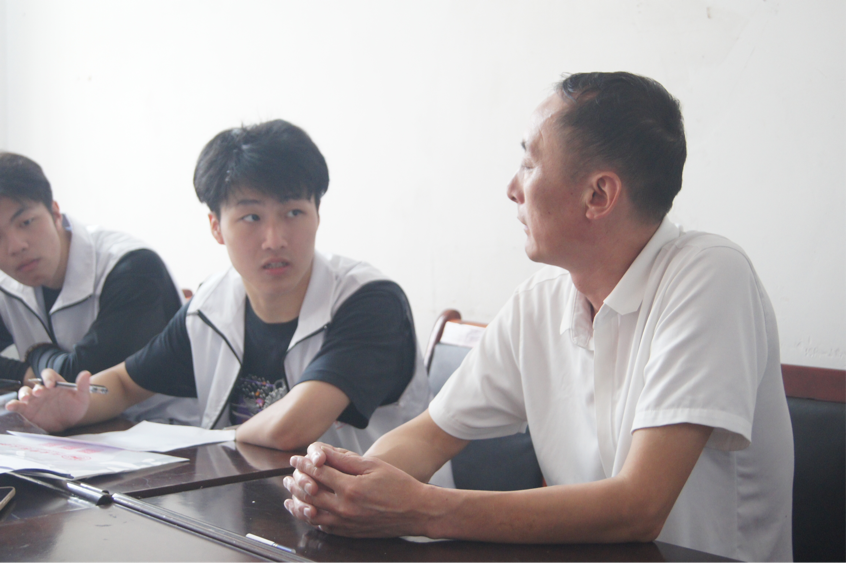 当天早上,阳光洒满吉信镇的田野与村落,“逐梦青春”三下乡队伍的成员们踏上了调研之旅。在当地社区干部的接待与细致安排下,队员们迅速融入社区,与居民们展开了交流与互动。在社区中心,队员们按照事先制定的调研计划,分成两队,一队负责与居民面对面交流,深入了解他们对于农文旅融合发展的看法与建议;另一队则专注于问卷调查工作,针对当地儿童青少年的生活习惯进行调查。