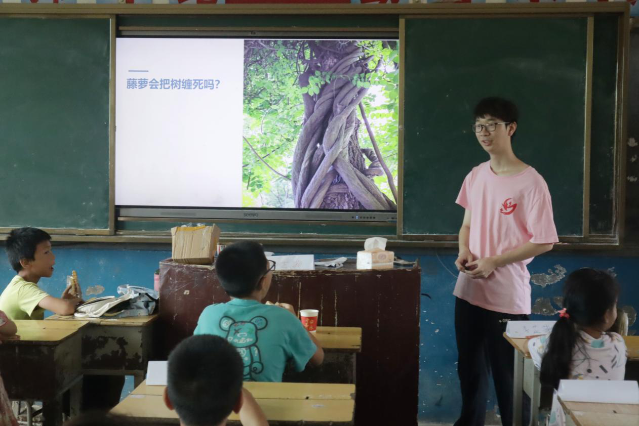 自然科普课程由实践团成员段振宇和田祠亘主讲,分为生物和免疫两部分。段振宇以问答互动的形式引导同学们探索动植物的特点及其成因。田祠亘将免疫学知识与动画相结合,在播放动画视频的同时,为孩子们讲解和总结相关知识。在两位主讲人由浅入深、生动形象地讲解下,同学们窥探到了自然的奥秘,也感受到了科学的魅力。