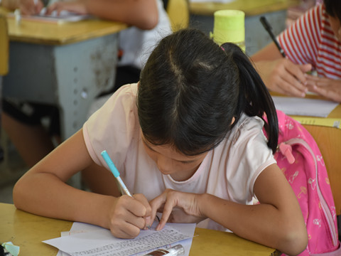 此次考试旨在对夏令营学员十天以来的学习情况进行检查,考试卷题型分为三类,古代神话人物典故,古代诗歌所运用手法以及诗句默写,语文写作。在有关古代神话人物典故中,考试主要针对女娲和神农提出疑问。对于古代诗歌的考察主要以默写十天所学诗歌为主,在考试过程中少部分学生因对诗歌内容不熟悉导致丢分,但大部分学生还是完成了此次考试的默写。最后的写作环节是此次语文考试的重点,作文题目是《我最喜欢的一本书》,在写作过程中学生们喜爱的图书多种多样如《追风筝的人》、《狼图腾》等。在写作过程中,大多数学生对自己喜爱的图书见解颇多,在文章写作中,学生周芷忆如此写道:“通过读书,我不仅看到了里面人物的坚持,同样他也激励着我自己要不断努力。”