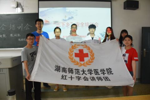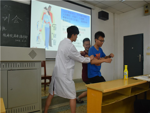 培训伊始,李函径向大家介绍了晒伤和烧烫伤方面的常识,如防晒的小技巧、应如何正确的防晒等等,并教会大家遇到不同程度晒伤和烧烫伤时的急救措施。随即,杨海燕为大家介绍了动物咬伤的救护措施,考虑到三下乡的地点环境,她将动物咬伤分为了猫狗咬伤、蜈蚣咬伤和毒蛇咬伤三类,讲解了被咬伤后的急救方式、怎样防止被动物咬伤的方法以及怎样辨别毒蛇,并且强调被毒舌咬伤时,不可用嘴去吸。王人柯向大家介绍了海姆立克急救法,这是一种利用肺部残留气体,形成气流冲出气道异物的急救方法,他利用了互动的形式展示了应如何应用此方法,针对儿童、极度肥胖及怀孕的人群也做出了讲解,强调了应用不同的方式进行急救。培训结束,讲师团与负责人合影留念。