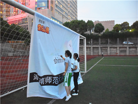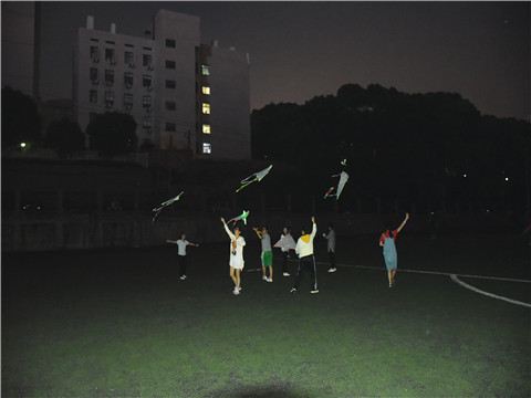 参与活动的人员抵达田径场进行签到登记后,在工作人员安排下进行卡片消消消、一起跳起来、闪光的夜空和get it off四个游戏。虽然游戏现场光线较暗,但在荧光棒的装饰下,整个球场充满了五颜六色的光芒。每位同学都积极的参与进游戏中,在游戏中感受着户外运动的魅力与快乐,现场欢笑声、欢呼声不断,气氛十分热烈。在闪光的夜空活动中,同学们将自制的荧光风筝放飞天空,一只只风筝宛如星星一般在夜空中闪闪发光引得现场同学拿出手机不断拍照从而记录下这美好的画面。活动最后,工作人员给现场同学发放纪念品,并集体合影留念。