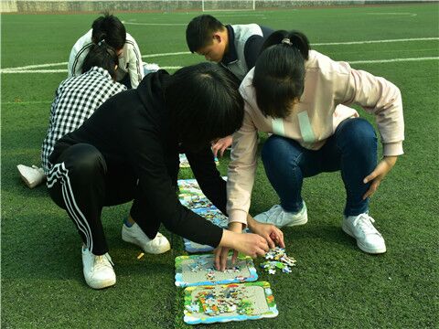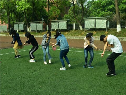 活动开始前,各负责人在田径场做好相关准备,组织参赛人员签到、分组,并与其讲解赛事相关注意事项和比赛规则后活动正式开始。此次活动共包含五个环节:“投球入盒”、“四人五足”、“拼图游戏”、“杯口相传”和“乐踩气球”。各组成员需先派一人进行象鼻子转圈,完成之后拍组员的肩膀让其进入第一个游戏环节,并依次完成后面四个,先完成游戏的前三组为获胜组,有奖品。第五个环节“乐踩气球”,参与者要在保护自己气球的同时将其他队伍的气球踩爆,最后还留有气球的人所在的组获得最后的胜利。