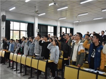 主持人肖悦峥致辞并介绍主讲人,团课成员鼓掌欢迎。李强提出在场学生拥有哪些身份的论题,引出学生们应该扮演好团员角色的阐述,并指出在现实中团员存在的一些问题,希望团员们能了解熟悉共青团知识、团的章程。有团员的组织意识和身份认同感。随后,李强播放共青团团歌《光荣啊,中国共青团》,带领着全体团员宣读入团誓词以此来增强团员们对团员身份的认同感。