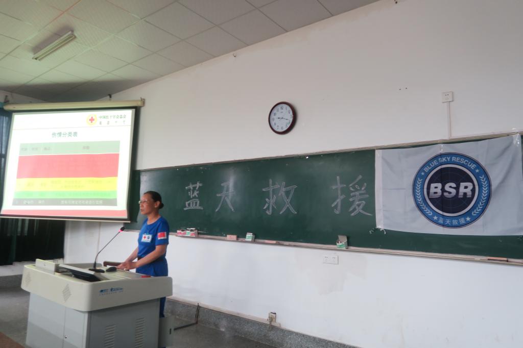 此次培训分为两个部分:理论培训和实践操作。在上午的理论培训中,教官黄爱东为大家讲述了有关意外伤害的应对措施。她以放映幻灯片的形式,结合自身救援经验向学生展示了关于溺水、一氧化碳中毒、中暑、烧烫伤等情况的紧急救护措施。随后,教官黄倜傥为大家阐述心肺复苏术的具体步骤并述说其重要意义。