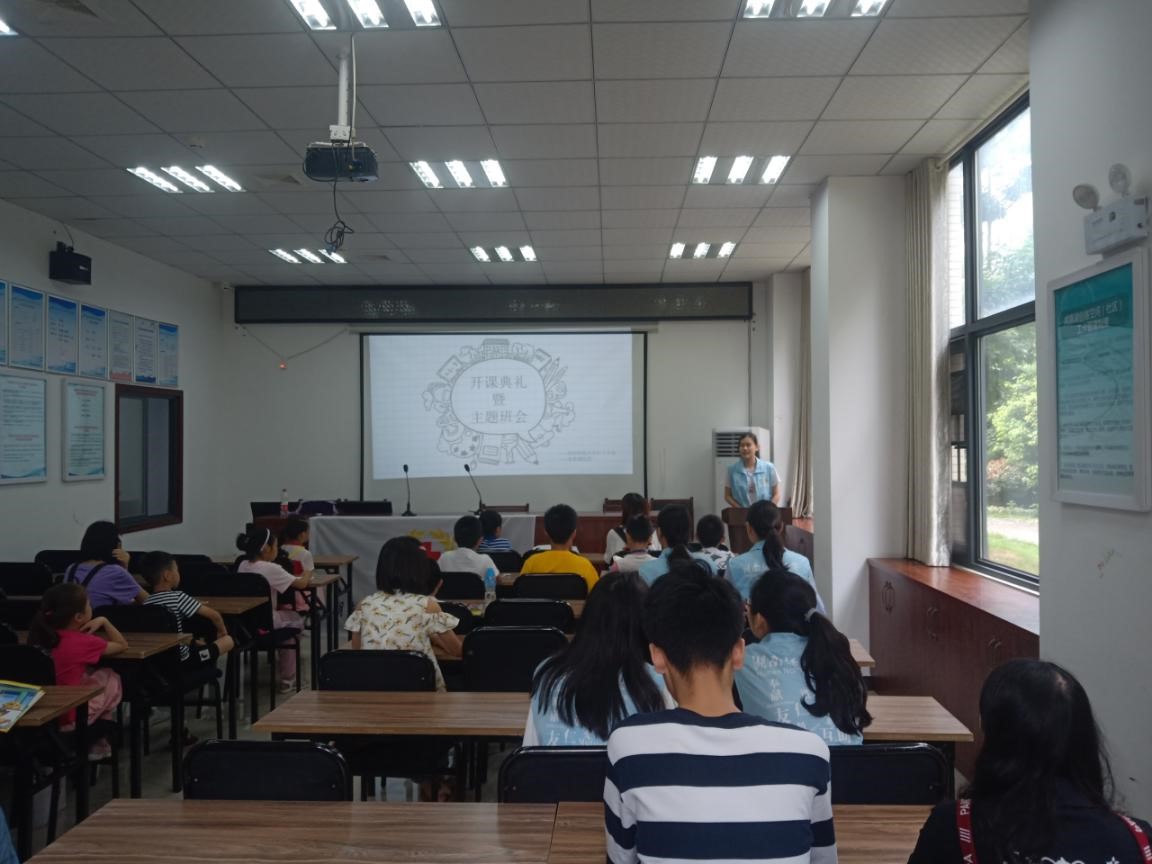 全体支教成员到达目的地后,陈明珠与咸嘉湖社区主任杨柳清进行交接,其他成员则开始准备布置开学典礼的相关事项。全体学生到齐后,开学典礼暨主题班会正式开始。