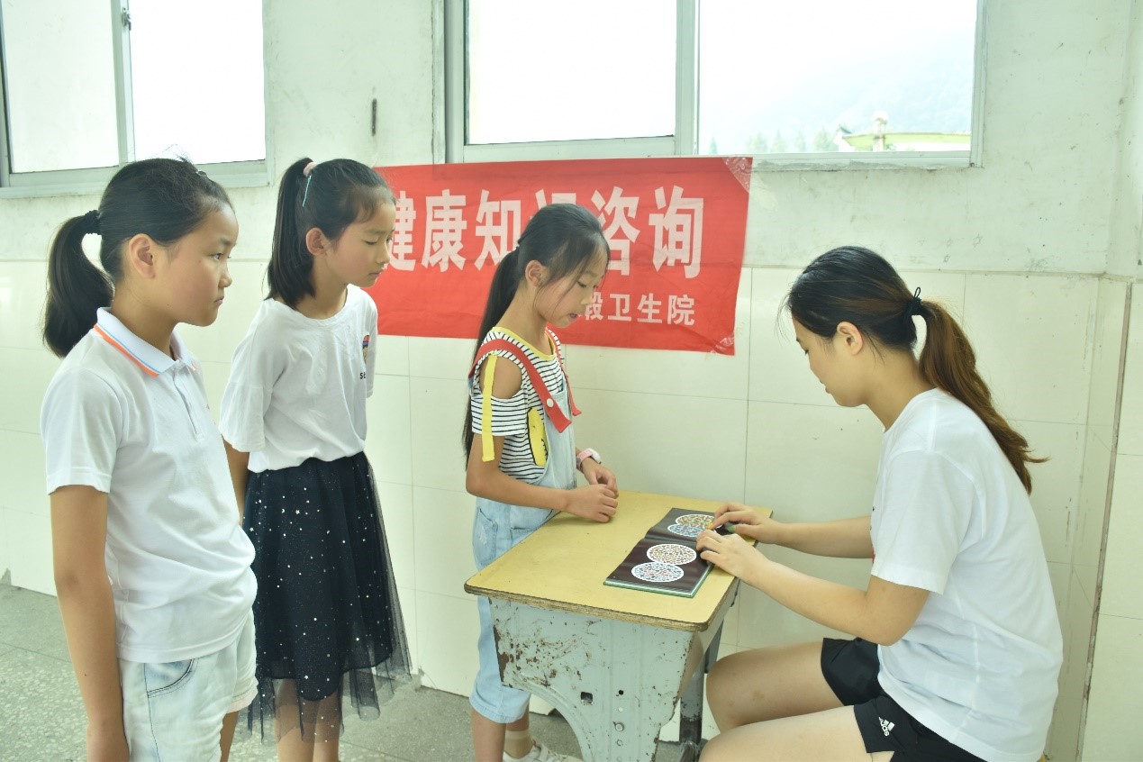 体检中团队也遇到了比较害羞的小朋友,队员鼓励并陪伴他们完成了体检;亦遇到了视力问题相较严重的孩童,负责体检的队员详细询问了其平时的用眼习惯和用眼强度,并提出了一些保护视力的方法,小朋友们受益良多。