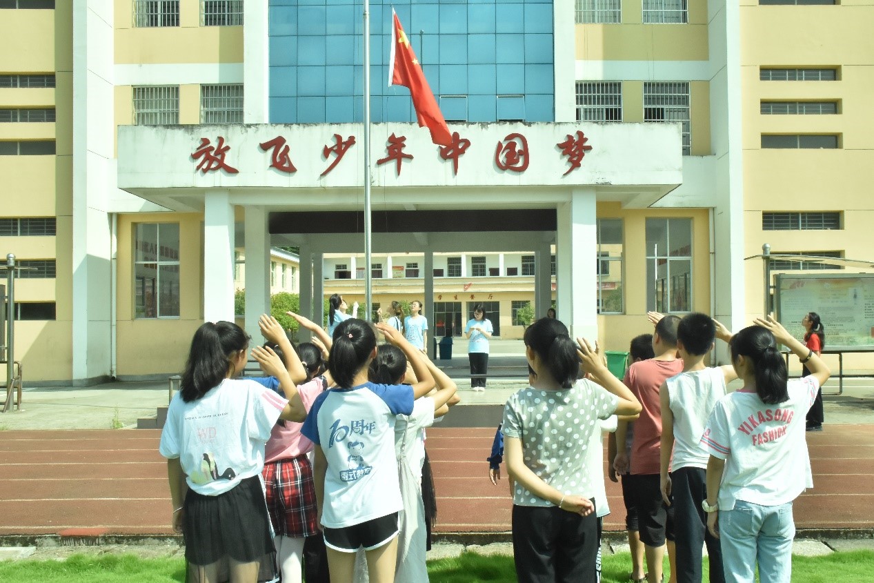 7月22日上午,金沙官网“天使在人间”暑期社会实践团成员带领支教学生于铜鼓县大塅镇中心小学操场举行升旗仪式,弘扬红色文化,传承爱国精神。