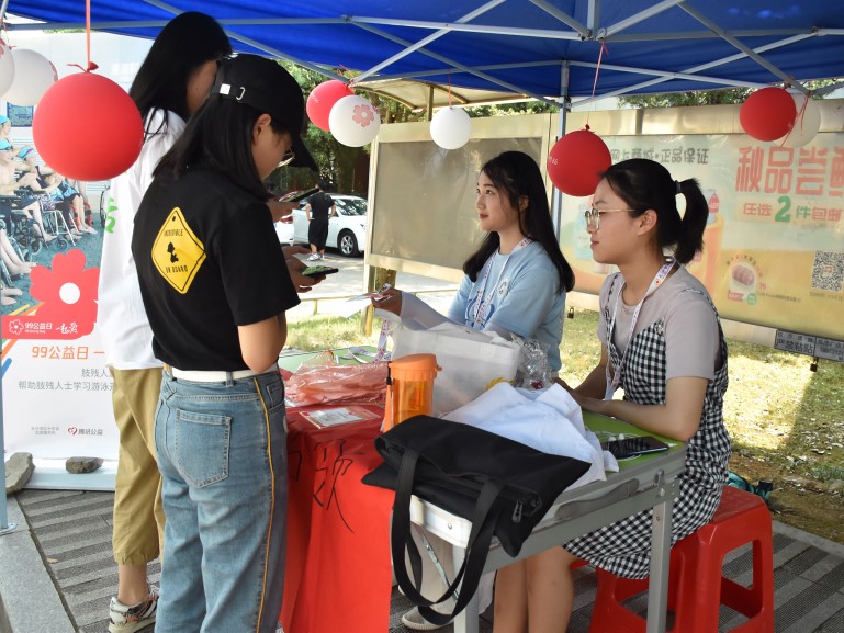 此次活动总共分为两部分,其一为部分志愿者在院主干道两旁进行摆点,宣传市红十字会志愿活动相关项目,进行九九公益日为肢残人士游泳服务的集资活动,致力于帮助肢残人士学习游泳开展康复训练。在学术报告厅前,其余的志愿者将获取的唐氏综合征家长互助中心的活动爱心包中的物品分类并安装完毕后,他们整齐排列,利用爱心包中的小国旗与小红花来拍摄视频《我和我的祖国》,在歌声中,挥动手中的小国旗和小红花,致敬祖国的同时,也号召他人积极了解关心唐氏宝宝,给他们的未来聚集力量,送去温暖。活动结束后,负责人会将所募捐的资金和视频资料交接给相关负责人,为唐氏宝宝以及肢残人士助力。
