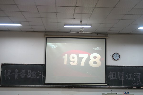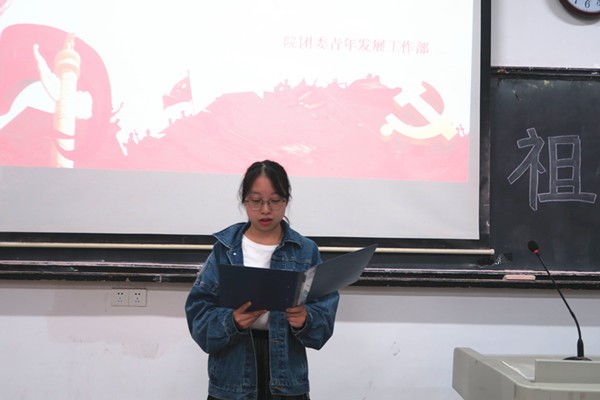 活动伊始,主持人赵呈洁简单强调会场纪律,团课正式开始。此次团课以播放视频的方式进行。视频主要展示了中国从1949年成立以来发生的巨大变化,带领学生们领略了新中国的风采,祖国的大好河山和有趣的风俗民情。在场学生认真观看视频,并有所启发与思考。在视频播放完毕后,主持人致谢幕词,对此次活动做出总结,并鼓励号召学生们努力学习,为新中国的发展建设贡献自己的力量。活动结束后,工作人员合影留恋。