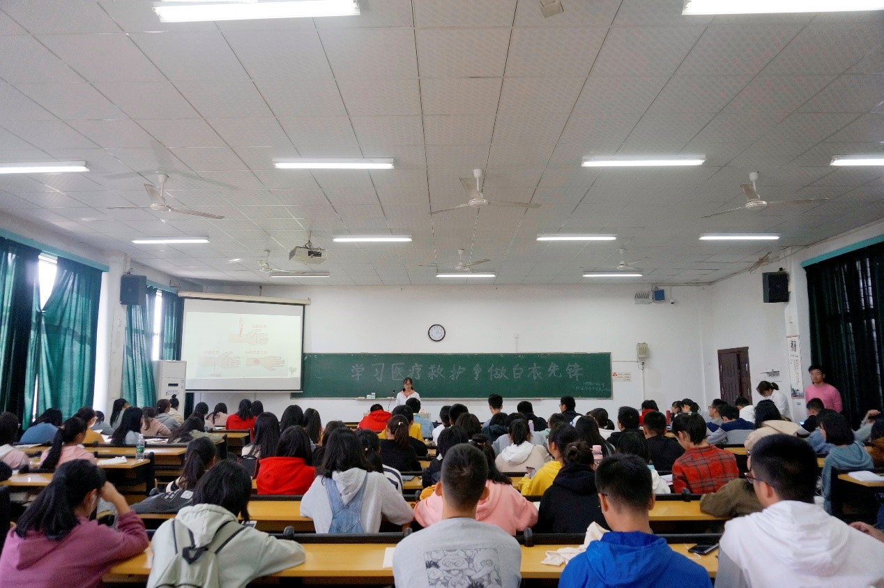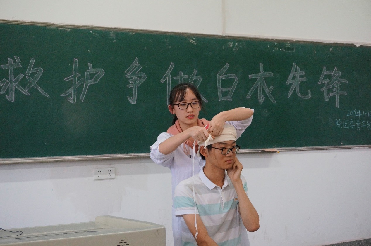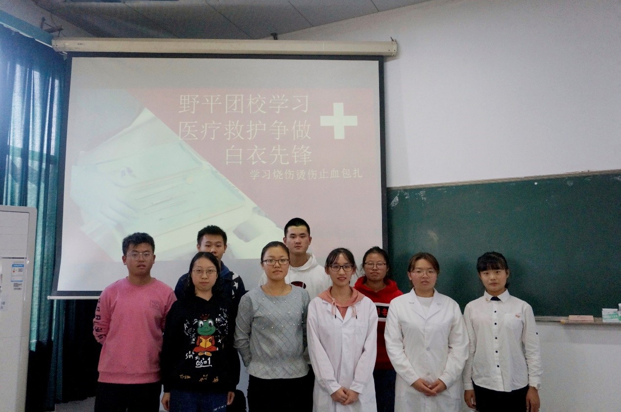 10月31日中午12点半,金沙官网团委青年发展工作部于勤医楼八教室开展了以“学习医疗救护,争做白衣先锋”为主题的野平团校团课。知行合医健康知识宣讲团的成员贺玮、胡萍受邀作为此次团课的主讲人,技能班全体成员参与此次团课。