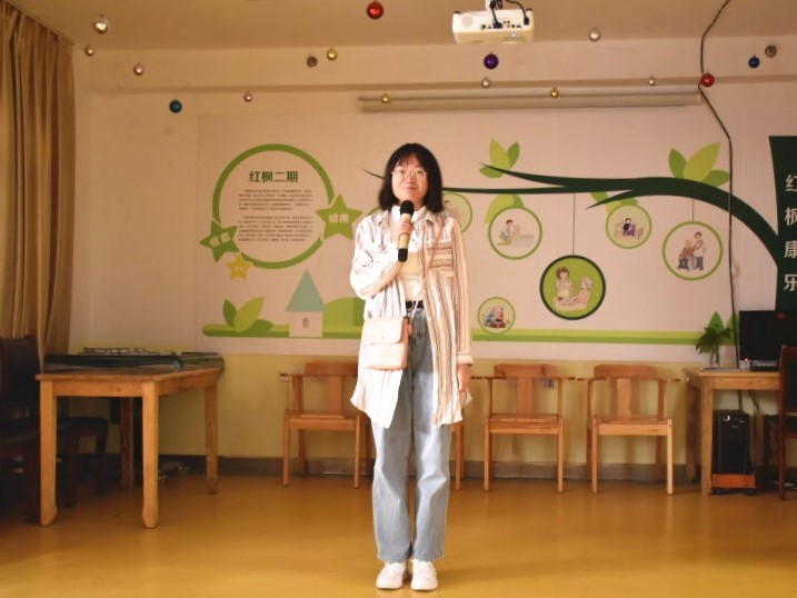 到达养老中心后,活动负责人王尔聪与养老中心负责人对接,引导志愿者们安静有序地进入室内。活动分为才艺展示和陪伴老人两个部分,节目形式有合唱、弹唱、脸谱和朗诵。志愿者们依次上台为老人展现准备好的节目,其中歌舞《最炫民族风》点燃全场气氛。创新型节目《说唱脸谱》更是赢得老人们的连连惊叹,拍手叫绝。现场的部分老人由于身体原因无法观看节目,志愿者们便陪伴在老人的身旁轻声问候。