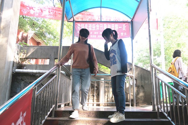 活动伊始,同学们分为四组,且三人组成一个小组。第一个项目开始后,四组的同学分别于四条路线上的出发点集合。各组选出一名同学戴上眼罩,另外两个同学在旁边引导其走过指定路线。在抵达线路的终点之后,戴眼罩的同学又在另外两个同学的帮助之下,经过了一段设有障碍物的盲道。顺利走过盲道之后,便是蒙眼写字和蒙眼猜字环节。活动过程中由蒙眼的同学写字,另外两个同学猜字。随后反过来,由另外两个同学在蒙眼的同学后背用手画字,让其正确猜出所描述的字。活动进入最后一个环节,由蒙眼的同学在一个装有很多物体的纸箱里,任意摸出一个物体,并猜出物体的名字,答对三个即可。接着是各组的三位同学一起进行关于志愿者及志愿者精神的答题。