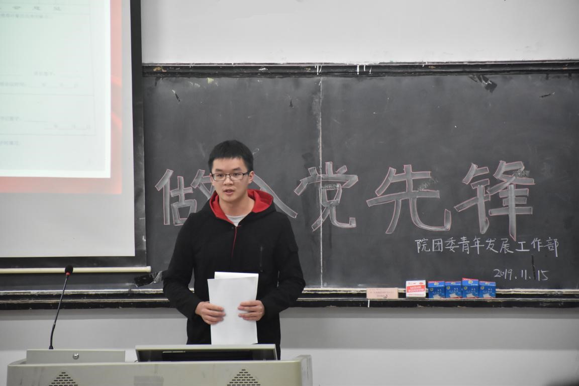 伍湘豫在介绍了本次团课旨在增加同学们对入党流程的了解后,团课正式开始。兰鸿翔从入党的四个阶段出发,详细讲述了入党积极分子的确定和培养教育、发展对象的确定和考察、预备党员的接收、预备党员的教育考察和转正四个阶段。黄纪飚介绍了党的历史,党的历史使命,党的指导思想,全国人民代表大会和入党动机。其中着重讲述了入党动机,并举出了各种的例子和入党过程中可能会经历的考验。