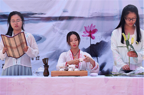 活动第一项为书画展开幕式。本次活动不仅邀请到了金沙官网党委副书记谢罗庚,院团委副书记李强和学工办张明明,而且邀请了老艺术家代表、长沙理工大学书法研究会会长杨珍,湖南省书法家协会副主席胡紫桂,湖南省大学生书法联合会名誉秘书长颜伟,湖南省大学生书法联合会秘书长唐毅以及各大高校书法协会代表及协会指导老师前来参加。由金沙官网学生刘重阳和张宇亭担任主持人。在欣赏完文学院汉韵协会表演的汉服舞《采薇》后,院团委副书记李强致开场辞,表达了对到场嘉宾的感谢。接下来,鹿鸣茶艺社为在场观众带来了茶艺秀表演并邀现场领导嘉宾一齐品饮。随后,湖南省书法家协会副主席胡紫桂发表感想,赞赏了这是一次别开生面的活动。紧接着,湖南省大学生书法联合会秘书长唐毅上台讲话并向我校赠送《第十届湖南省大学生书法作品集》。最后,老书法家代表杨珍发言宣布“风华杯”书画展暨“智绘杯”墨韵现场书画大赛正式开始。